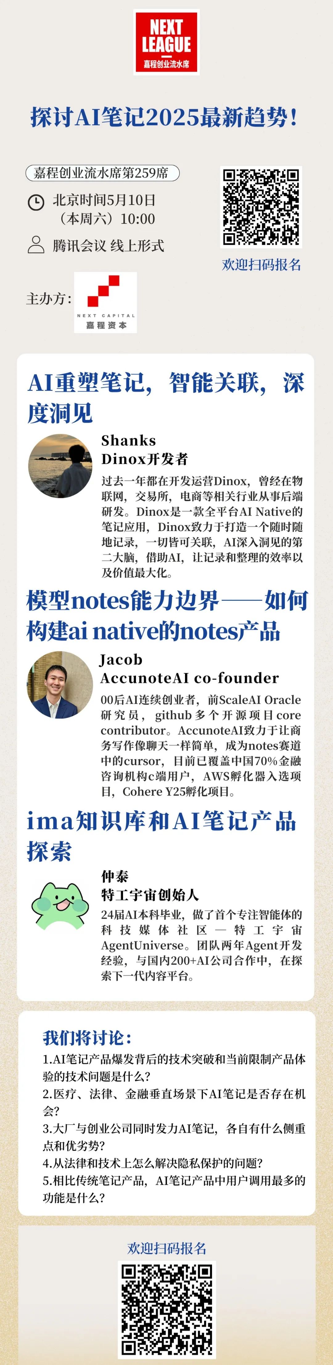 5月10日,本周六10:00,热爱创新的嘉程资本开启嘉程创业流水席第259席!我们邀请了Dinox开发者Shanks、AccunoteAI co-founder Jacob 、特工宇宙主理人仲泰一起深度探讨2025年AI笔记最新趋势!欢迎各位关注AI笔记领域上下游的研发人员、创业者、投资人和行业专家一起参加!
