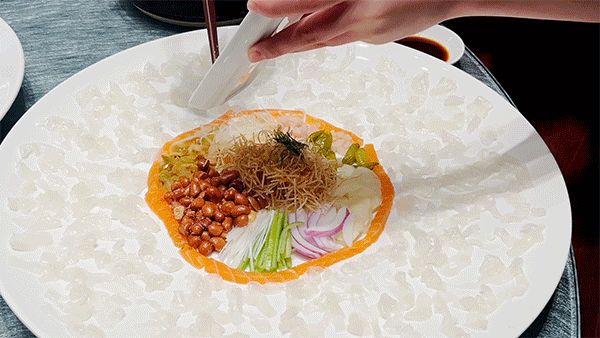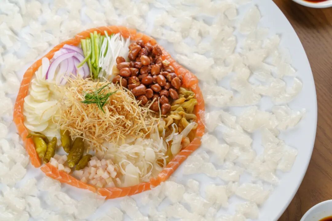 鱼生入口,舌尖感到一阵凉滑,裹挟着酸荞头的脆、柠檬叶的辛、炸芋丝的酥次第迸溅,丰富的层次感更将鱼生之鲜美尽数展现,实在是回忆无穷。