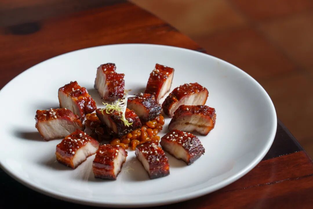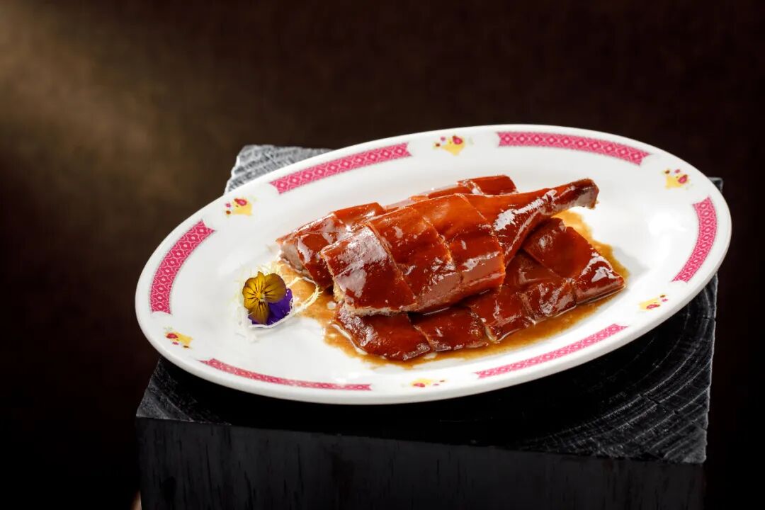 如琥珀般晶莹透亮的光泽表皮,在齿间碎裂时发出“咔嗒”清响,内里却保持着凝脂般的柔嫩,大理石纹路般的肌理美感,每一口浸润着酱香与蜜汁。