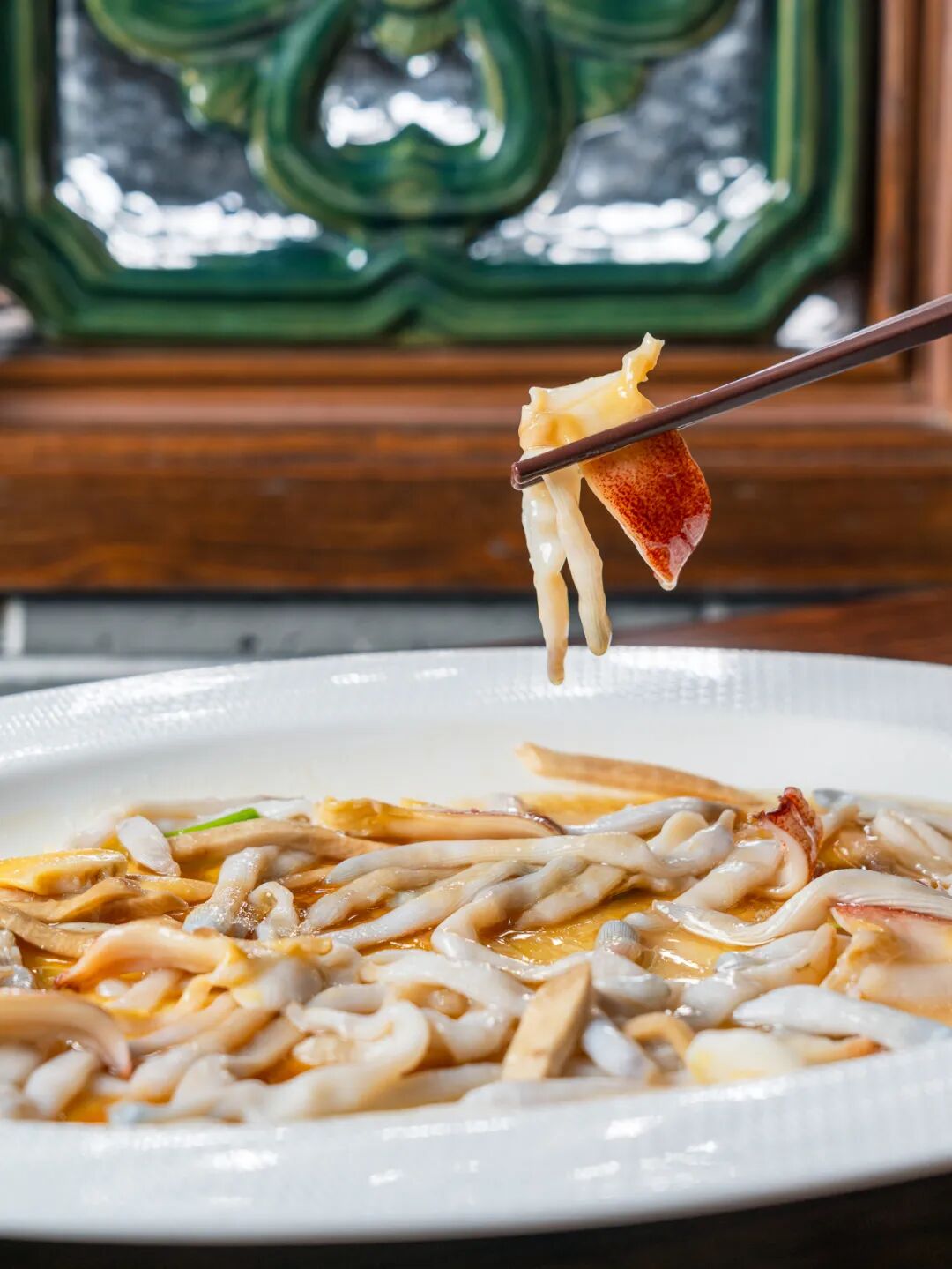 作为猪肉婆自创菜式,这道头菜丝蒸沙虫蚌仔,堪称山海风味的交响乐。看似质朴的广东容桂腌制头菜,实则是打开海洋珍馐风味的密钥,广西北海滩涂沙虫的海洋鲜息、叠加象拔蚌仔的脆嫩提鲜,只需简单蒸制,鲜香便无限放大。