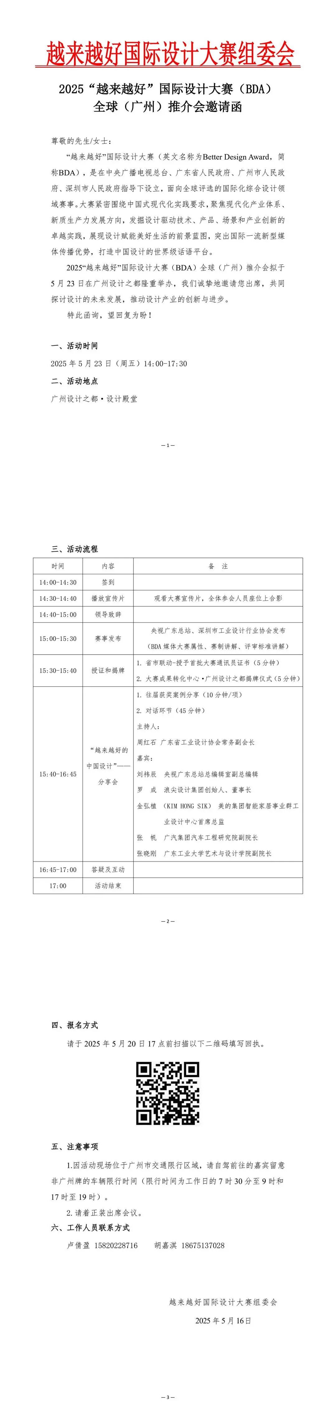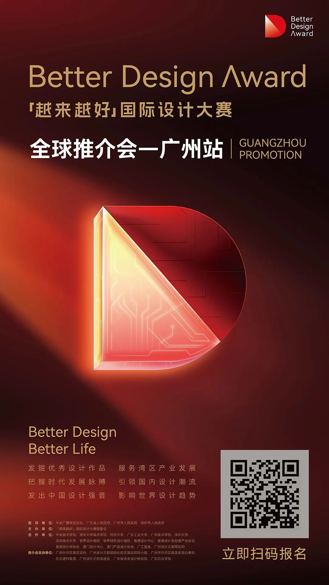 2025“越来越好”国际设计大赛(BDA)全球(广州)推介会拟于5 月 23 日在广州设计之都隆重举办,届时将举行大赛成果转化中心·广州设计之都揭牌、为大赛首批通讯员授证等活动。我们诚挚地邀请您出席,共同探讨设计的未来发展,推动设计产业的创新与进步。