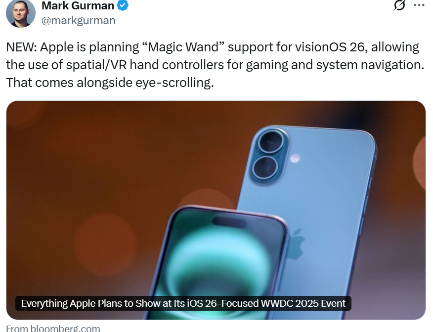 visionOS 26 将支持“魔法棒”功能,允许使用空间/虚拟现实手部控制器进行游戏与系统导航。
