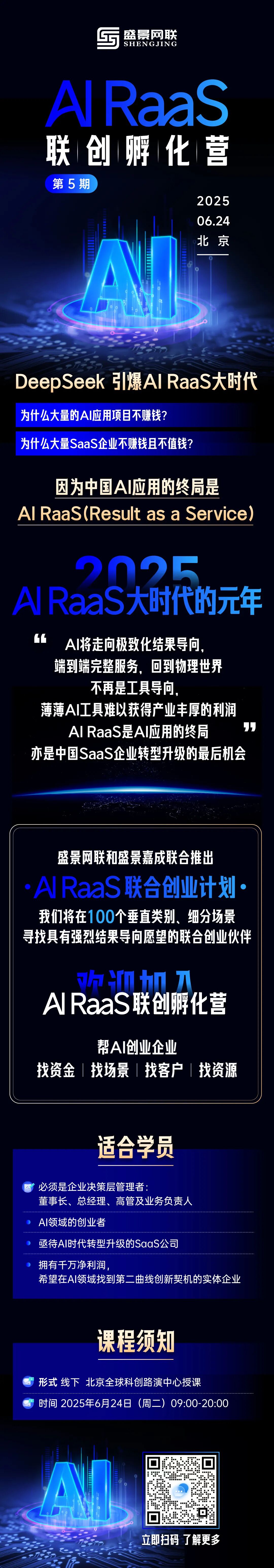 随着AI技术的到来,产业公司与数字化企业能够实现完美融合,这种强强联合将不断深化,并催生出新的AI创新机会。盛景发起“AI RaaS联合创业计划”的核心便是寻找那些敢于践行极致化结果导向的创业者,共同把握AI时代的巨大红利。