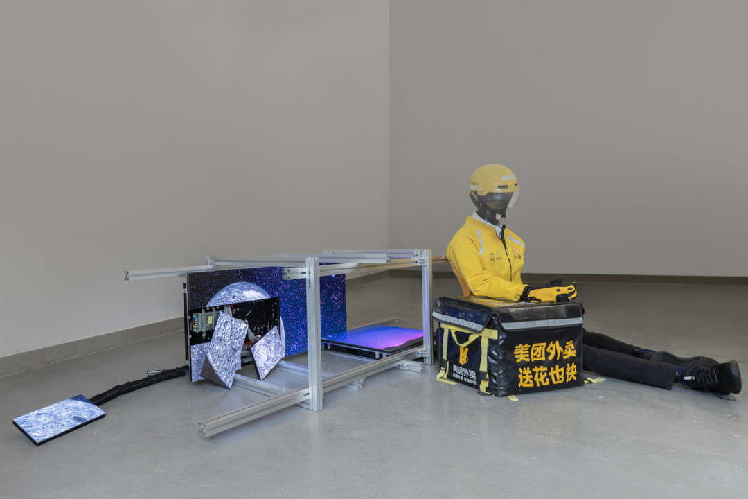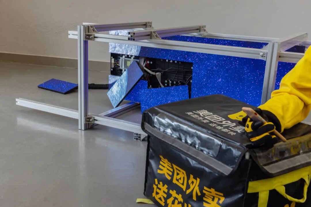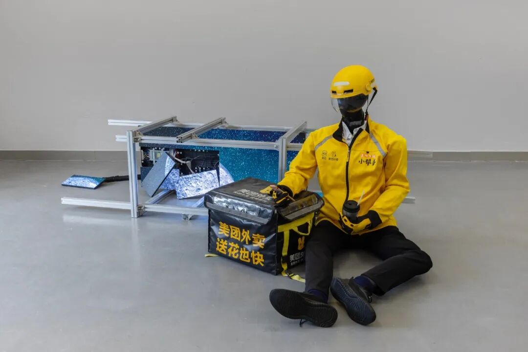 刘鼎的作品《等单》是整个装置的中心。在这件具有象征主义特征的现成品装置中,一位席地而坐的外卖骑手,背靠着一块不断循环播放着月夜的破碎的屏幕,在等待下一个派送任务的间隙小憩。他的眼睛紧盯着手机,不断地刷出带有民族主义倾向、情绪激昂的短视频。这是刘鼎为今日惶惶不安的人类绘制的图景,它指向贫穷、离散、政治压力、算法与极速经济下的新奴役,即作为压迫根源的现代政治与经济制度。
