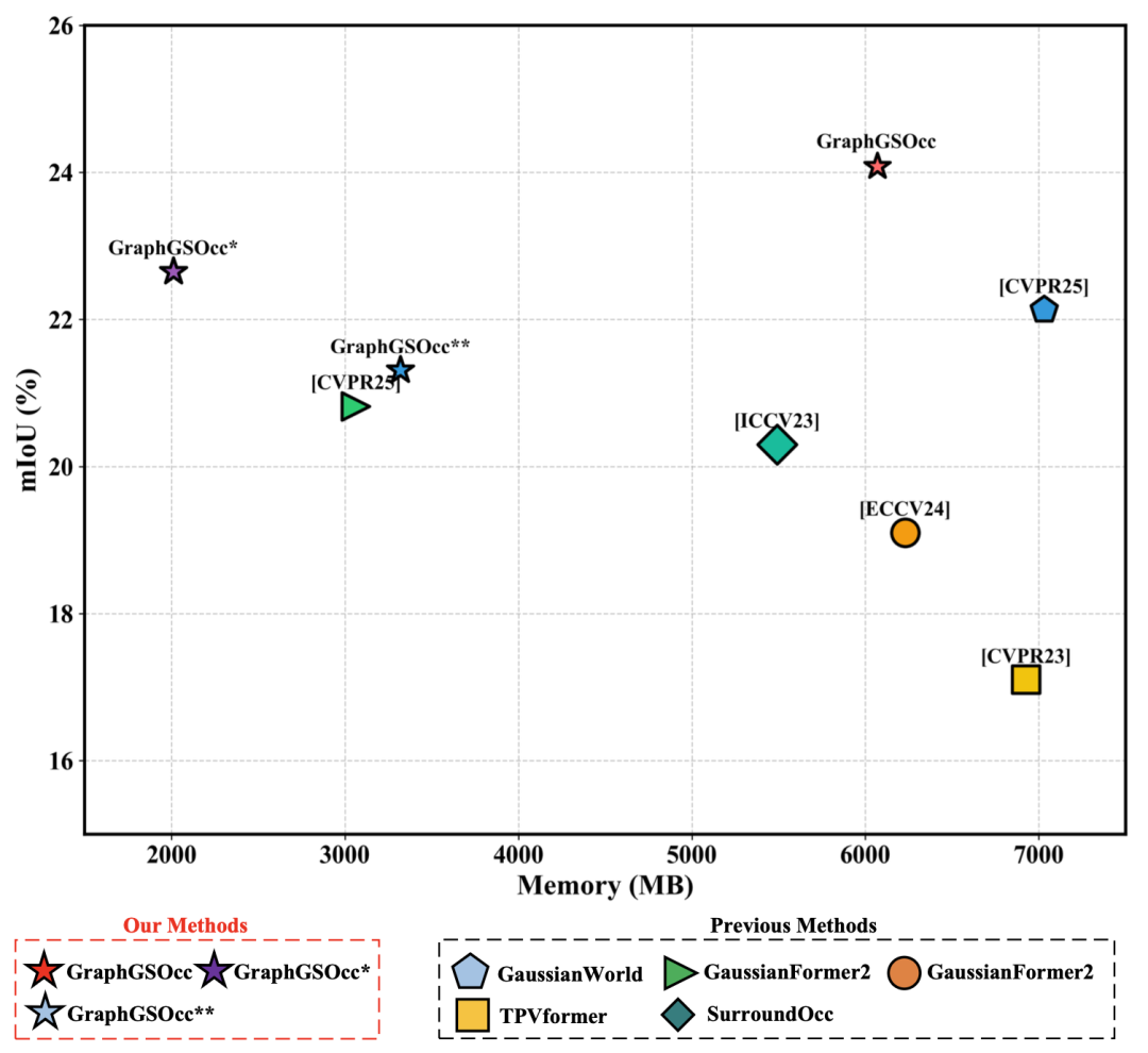 性能对比:与多种现有方法相比,GraphGSOcc在SurroundOcc数据集上达到了24.10%的mIoU,同时将GPU内存使用量降低到6.1 GB,显示出更高的预测精度和更低的计算成本。
