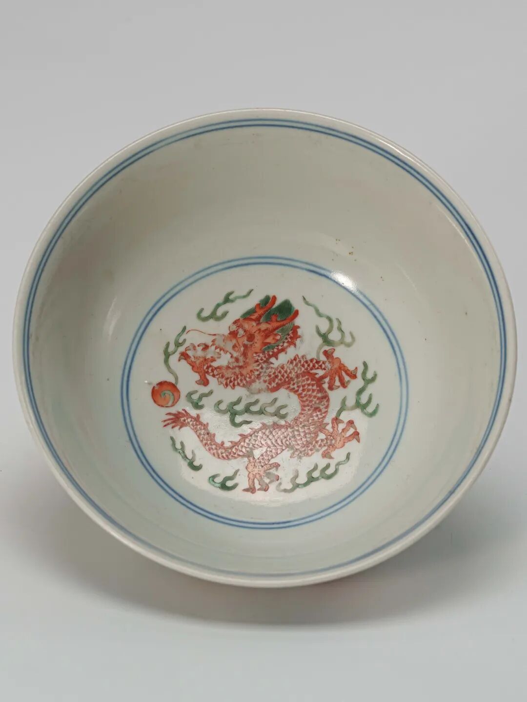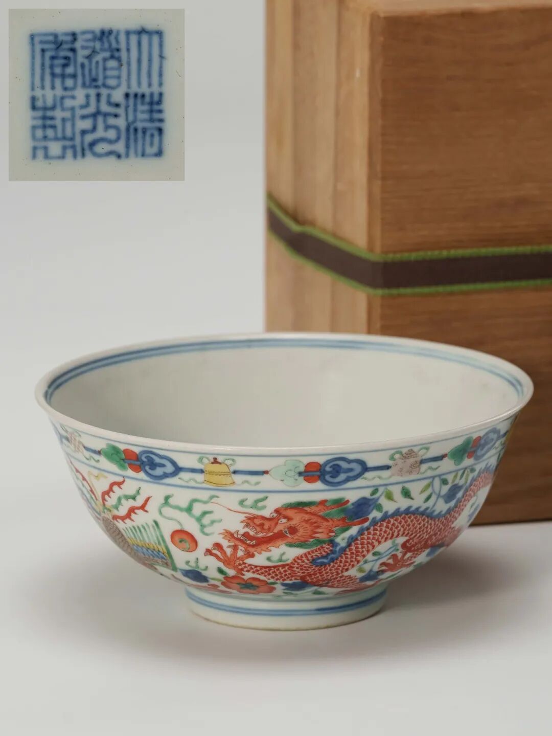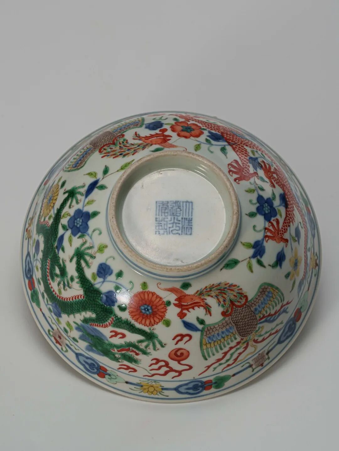 碗內底繪紅彩五爪蟠龍戲寶珠,龍體張揚有力,周身青焰纏繞,神采飛動;外壁近口沿一周繪紫、黃、綠三彩八寶紋,下方以青花五彩繪雙龍雙鳳圍繞,整體佈局呈中軸對稱之勢。雙龍一紅一綠,盤旋對峙,威儀赫然;雙鳳展翅,鳳首俯垂,間飾以纏枝花卉,色彩和諧,構圖繁縟而不亂,極盡宮廷器物之華貴氣象。龍鳳成對,象徵祥瑞昌隆,寓意皇權尊貴與萬壽無疆,常用於清宮重大慶典及儀典膳具之中。