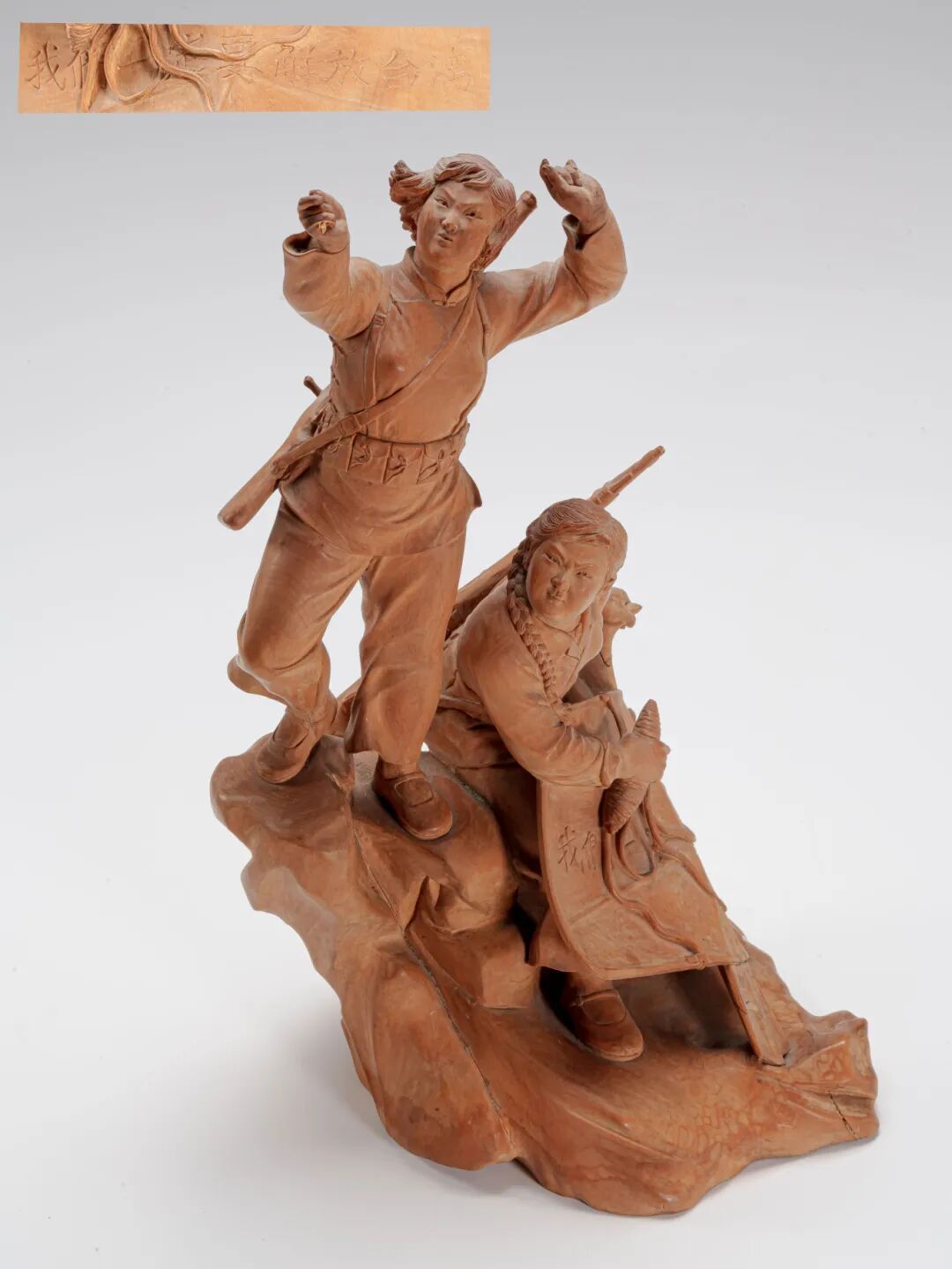 "此件木雕采用黄杨木雕刻,木质温润细腻,色泽明亮沉稳,属“海派”工艺典范。通体浅浮雕“我们一定要解放台湾”标语,字体刚劲有力,富有时代激情。画面中女子身着解放军服饰,神情坚定,遥望海峡彼岸,象征国家统一之志。