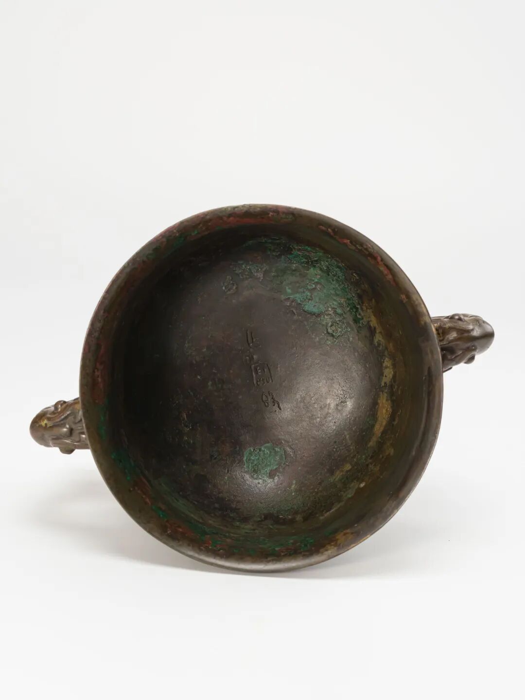 器內底部鑄銘文“作寶簋”三字,意為鑄此簋為祖先或神明獻寶,顯示出其禮儀用途與精神象徵。青銅簋作為古代盛黍稷之器,自商代初創,至西周時期制度日趨完善,款式亦日益豐富,常與鼎成組使用,彰顯禮制等級。此器通體泛褐紅銅色,點綴斑斑綠繡,銅質熟潤,包漿沉厚,顯露出代代傳承中自然形成的“老熟皮殼”,極富歷史沉積之美,亦為晚清至近代收藏體系中典型的傳世遺珍。而「作寶簋」銘文可見於《殷周金文集成》,編號3251,所錄為一件銅簋,雖非此器本體,然其器形、銘文皆與本品頗為接近。該銘亦被收錄於《三代吉金文存》、《小校經閣金文拓本》及《中日歐美澳紐所見所拓所摹金文彙編》等多部重要金文著錄中,足見其在學術與收藏體系中的代表性與價值,為研究西周早期禮器制度及銘文傳播提供了珍貴實證。