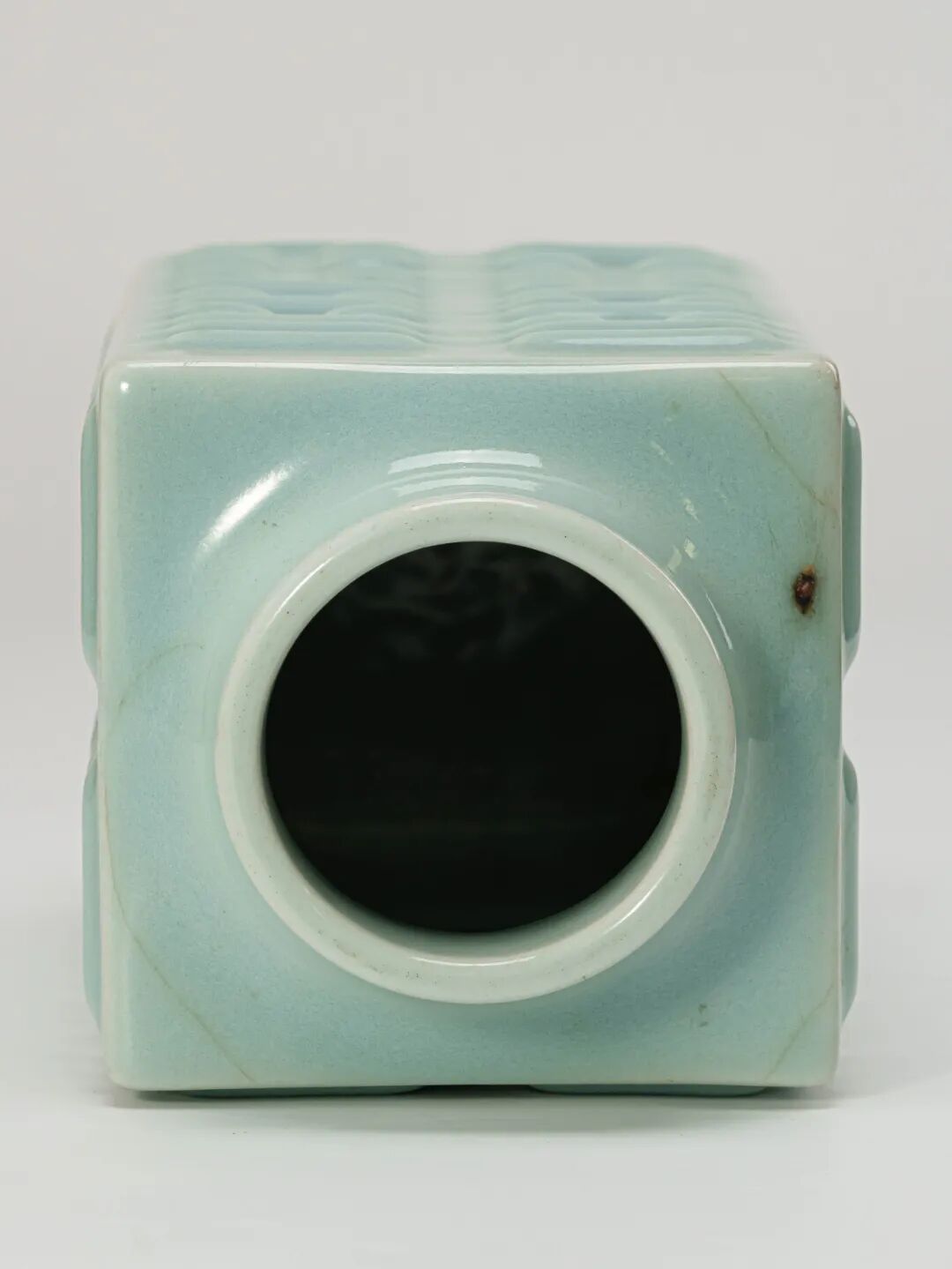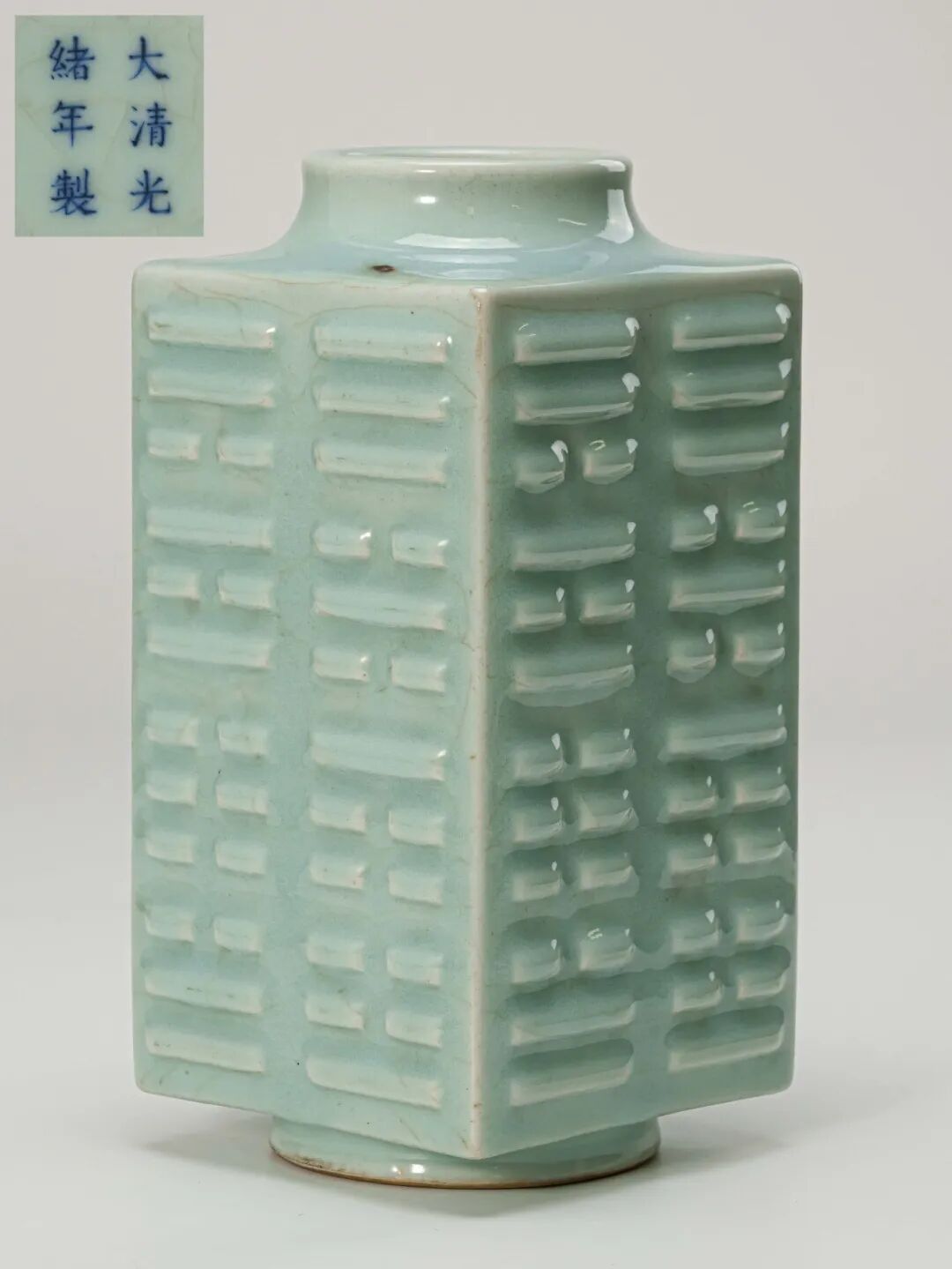 此件器作唇口、短颈,腹部方正挺拔,四面浮雕八卦纹饰,纹饰规整挺秀,寓意深远。下承外撇圈足,形制端庄肃穆,具极高礼器之感。通体施天青釉,釉质莹润细腻,色泽沉静淡雅,如青玉凝脂。釉面自然开片,片纹稀疏而有致,几道纵横贯通之纹,恰似天成,倍添古雅气韵。