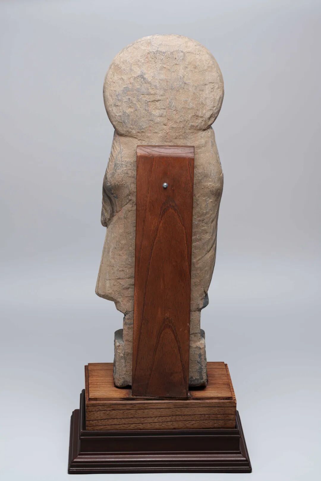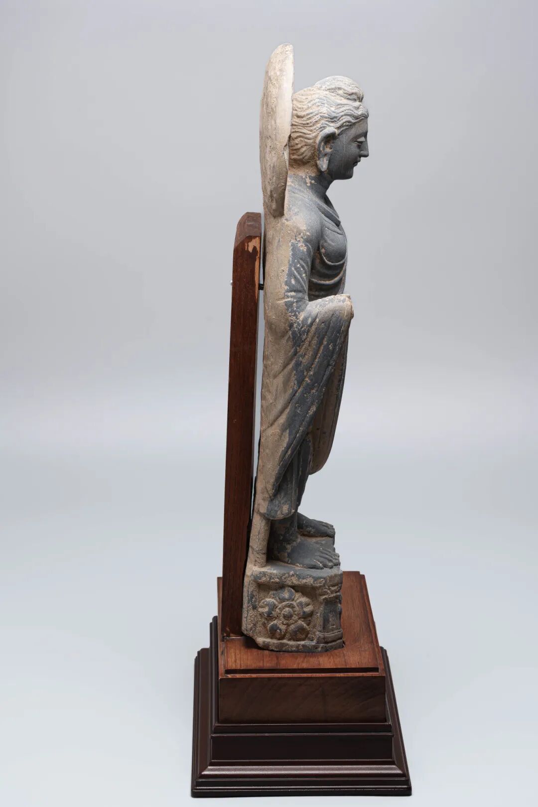 "佛陀身披通肩式袈裟,衣褶深重自然,跣足立於方形臺座之上。面容俊秀肅穆,波浪狀發束向後梳理,髮髻高聳;眉心白毫,杏眼垂視,嘴角緊抿,頭後有簡潔圓形頭光,整體呈靜穆莊嚴之感。
