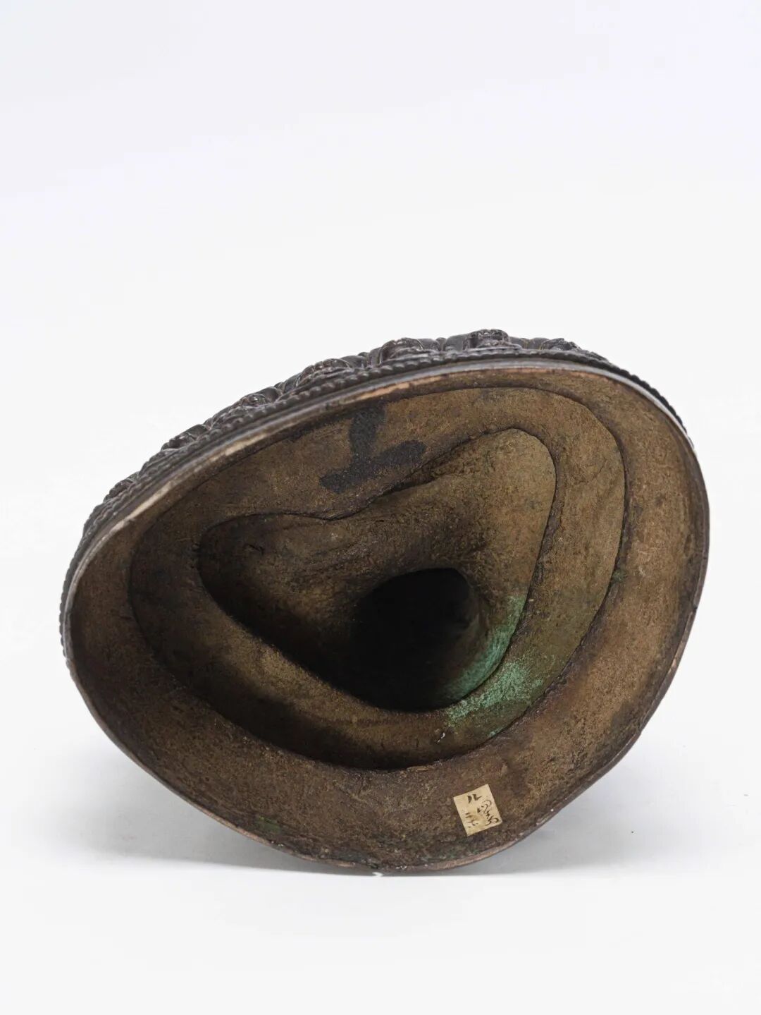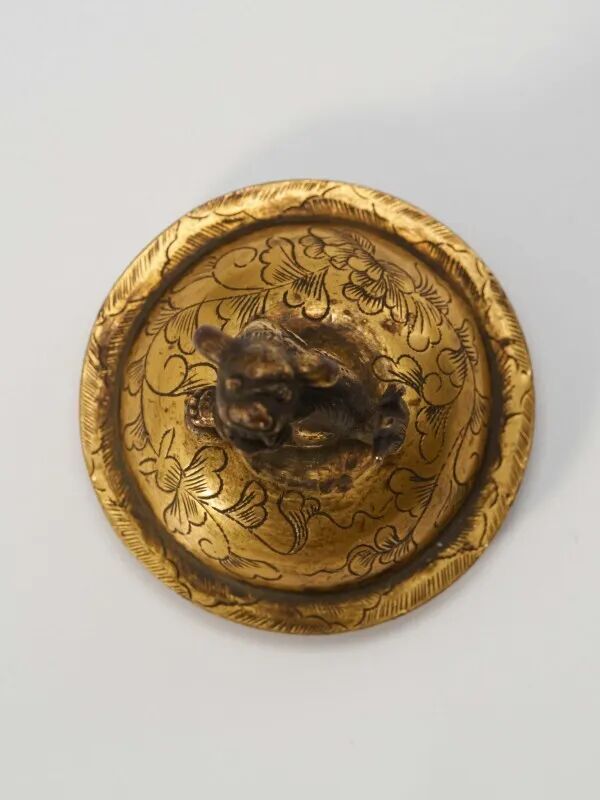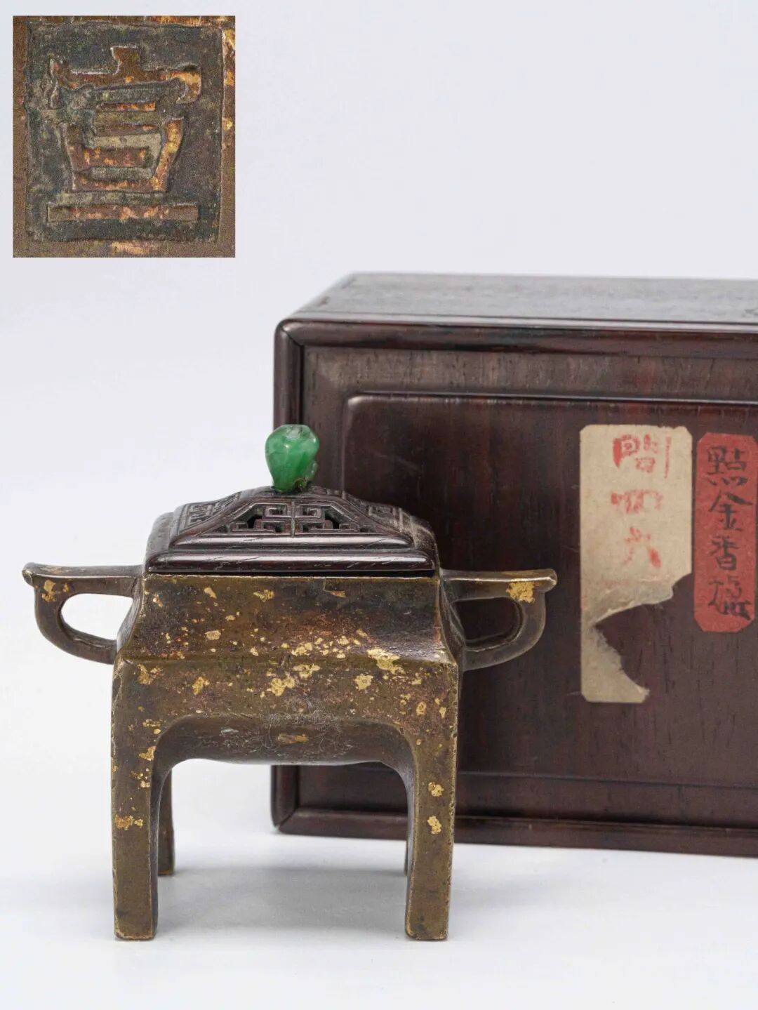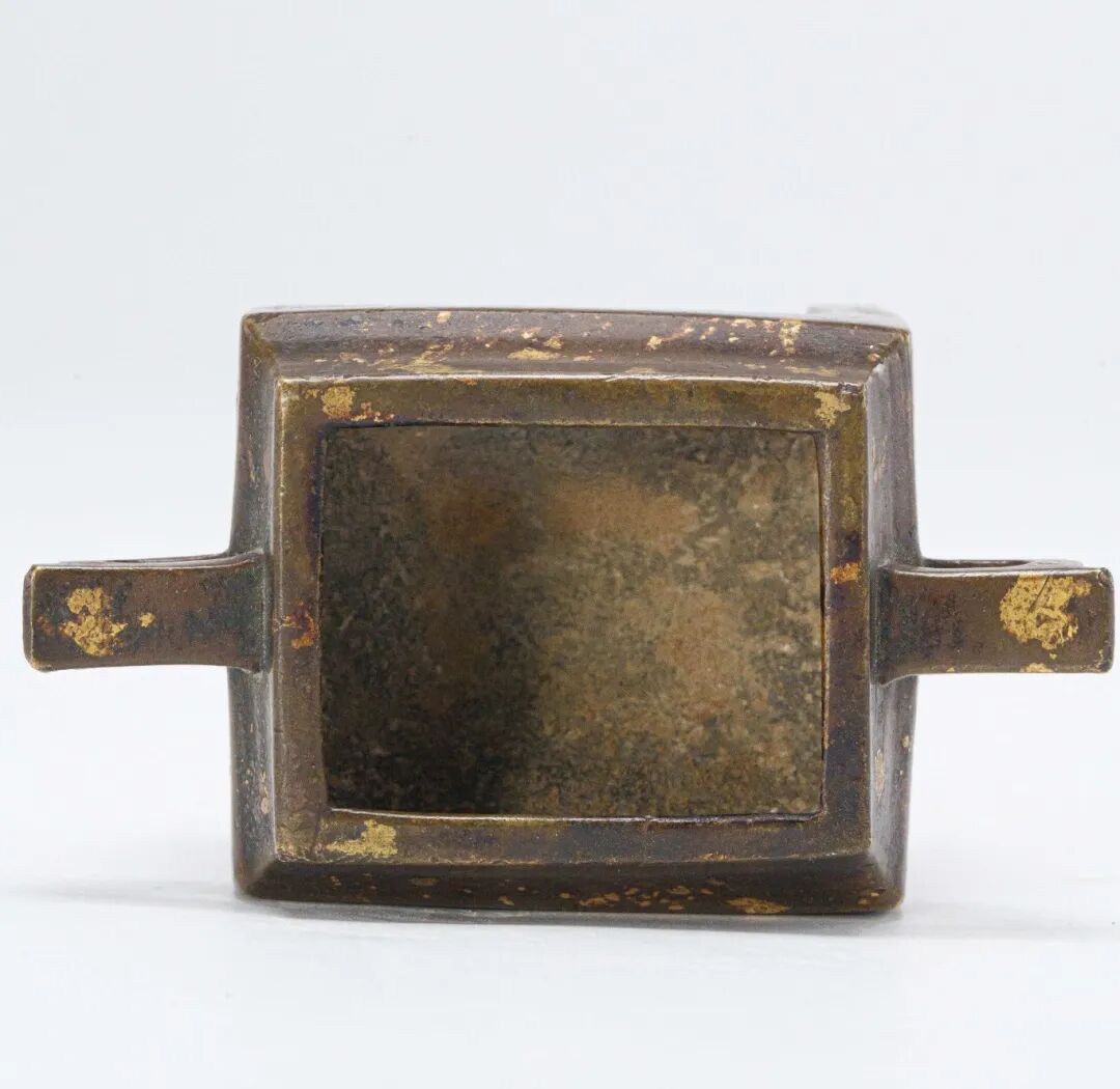 通体布满金黄色斑点,如雪花洒落,自然飘逸,为整体庄重古穆的气息增添了一分灵动雅致。底部中心方框内铸“宣”字楷书款,字体端庄挺拔,结构谨严,为传世宣铜炉中极为少见的款识形式,尤显珍贵。