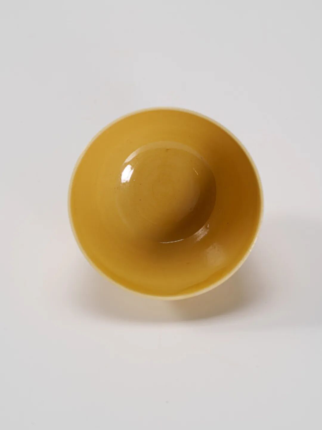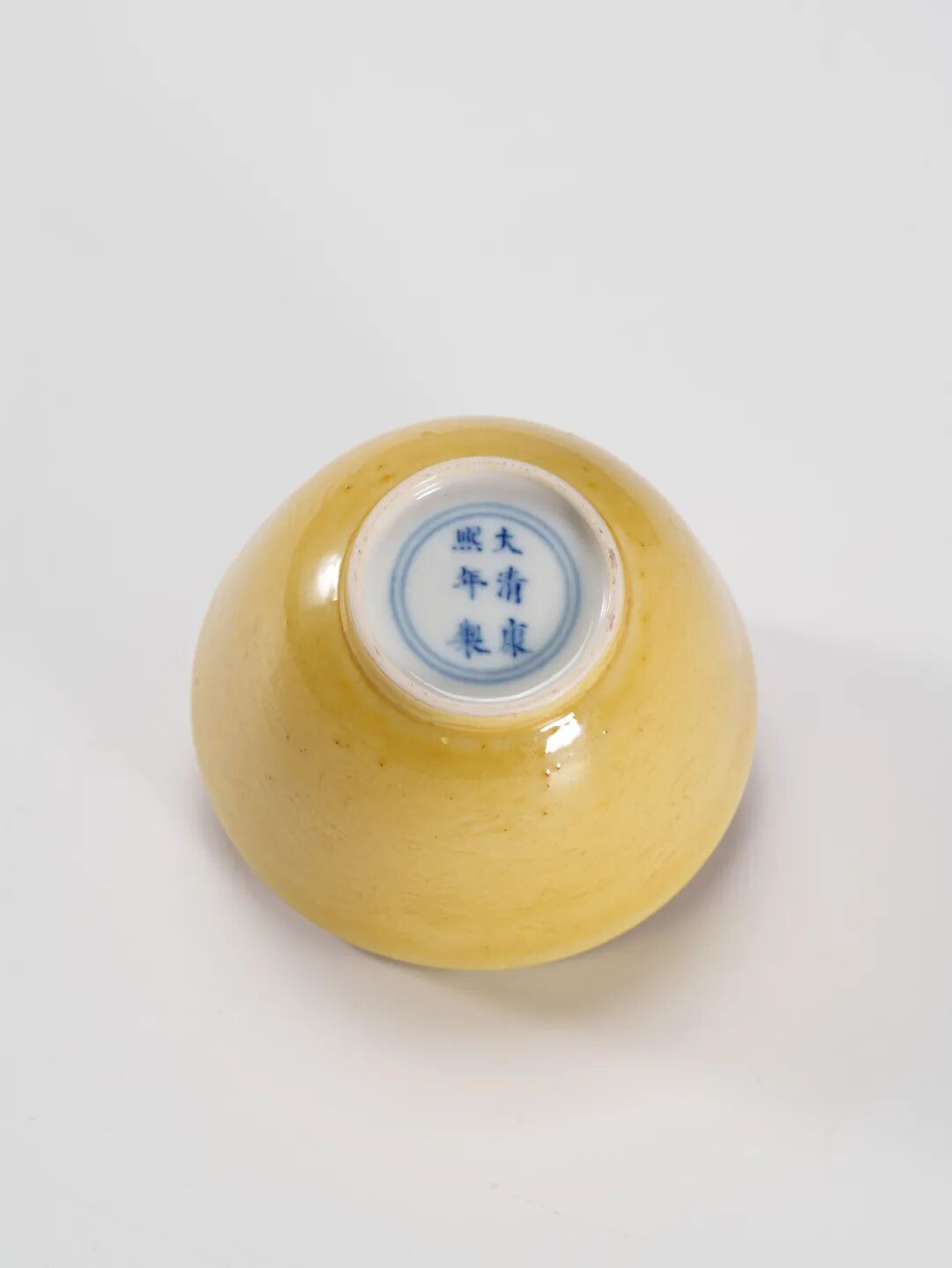 本品为大清康熙年制 米黃釉暗刻龍紋酒吞,正是康熙官窯黃釉瓷中的精品佳作。杯體小巧精緻,口沿微敞,深腹內收,圈足規整挺拔。通體內外均施明亮黃釉,釉面溫潤光潔,色澤純正高雅,黃中帶暖,盡顯皇室禦器之氣韻。腹部環繞暗刻雙龍趕珠紋,雙龍相對,姿態矯健,於祥雲之間追逐火珠,寓意祥瑞昌盛。紋飾隱而不顯,須細觀方知,頗具文人隱逸之趣,同時亦顯示出清初宮廷器物“內斂而不張揚”的審美取向。