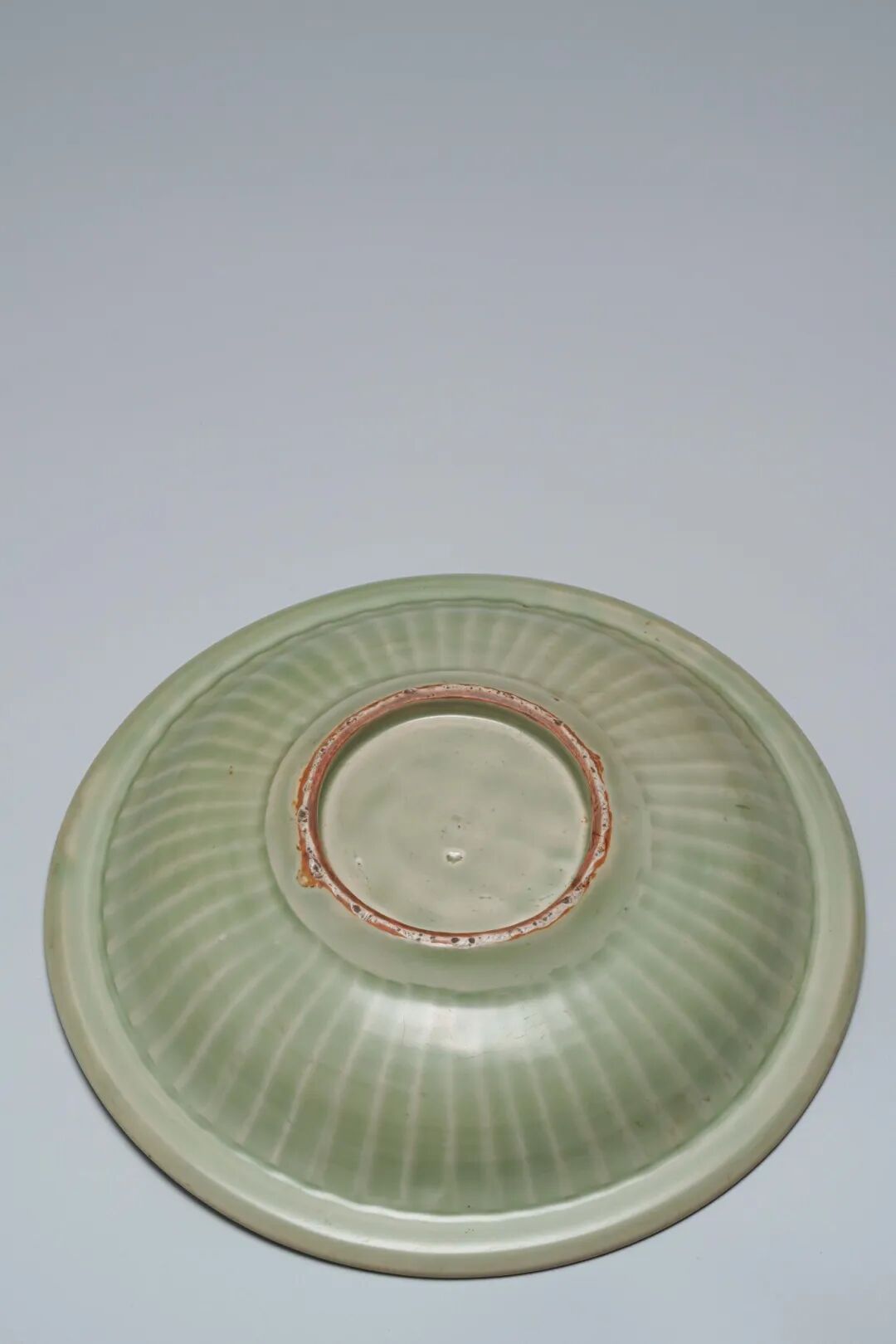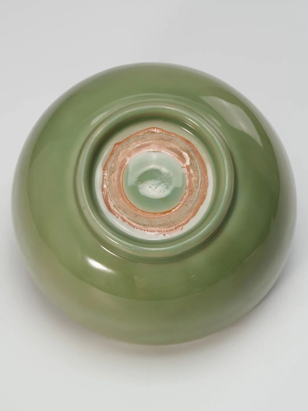 "這件處州青磁墩式碗,口沿微撇,弧腹内敛,下承小圈足,器形硕大,造型周正大气,规整之中透出韵致,沉稳之中不失秀雅。通体施青釉,釉质肥厚莹润,澄澈如水,温润若玉,尽显青磁温婉内敛之美。内外壁素面无纹,釉色淡雅古朴,气韵沉静高洁,予人以宁谧悠远之感。器底一圈涩胎垫烧,火石红鲜明醒目,为典型处州青磁的重要特征,堪称一件可遇而不可多得的官用佳器。