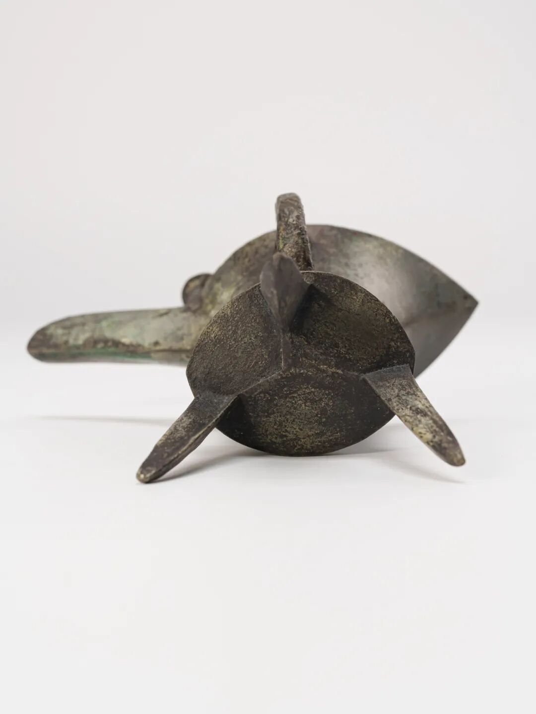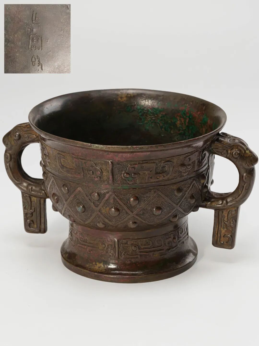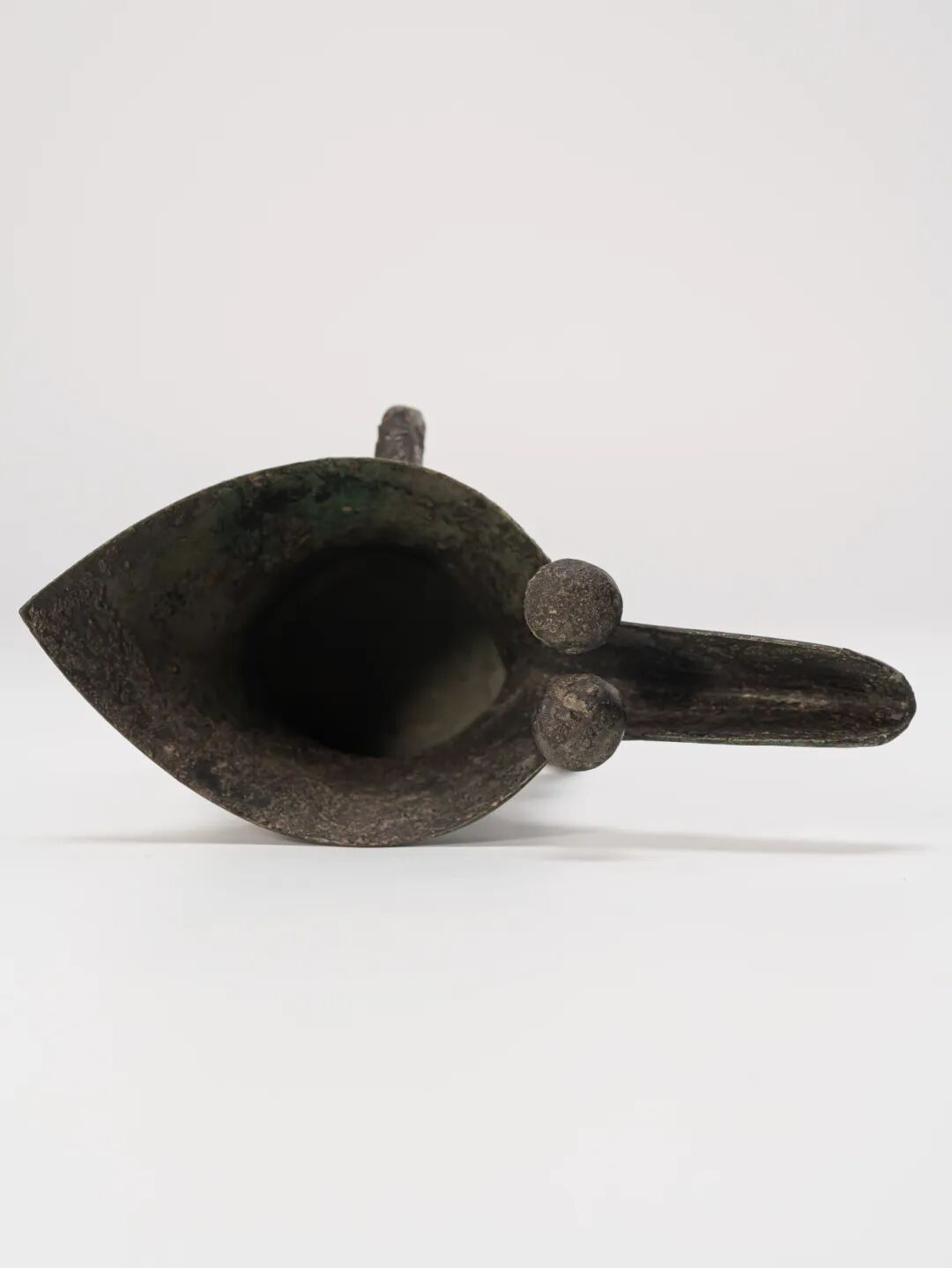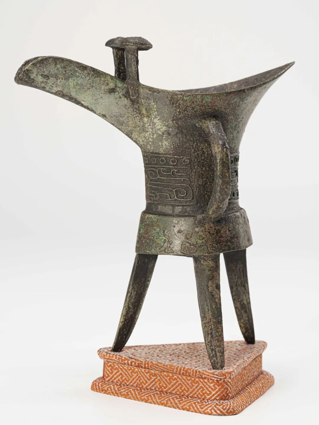 整器線條挺拔流暢,比例考究,工藝精湛。經歷數千年風霜侵蝕,器表綠鏽斑駁,色澤沉穩厚重,包漿古樸自然,沁潤之間散發出悠遠滄桑之氣,盡顯商代禮器的威嚴肅穆與深厚文化底蘊。