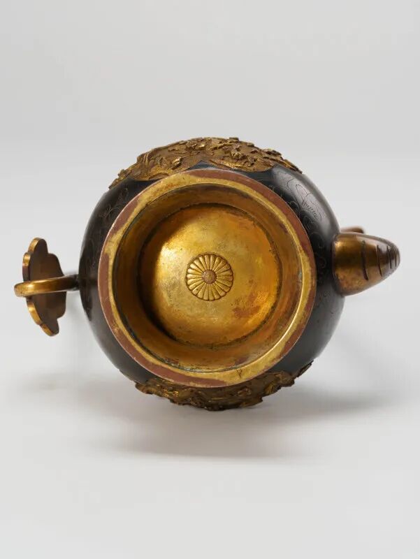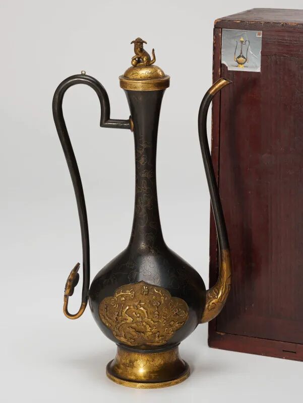 此件宫廷金银壶,腹部及底部局部镀有鎏金。壶身撇口,细长颈部,壶腹微鼓,饰有瓣形开光纹饰,圈足微微外撇。壶流弯长,曲柄配以壶盖。壶颈处饰有错金缠枝纹,盖顶饰狮钮,盖面同样刻有缠枝纹,造型写实传神,工艺繁复细腻。狮钮神态生动,筋骨遒劲,骨骼与肌肉结构刻画精准逼真。钮与柄以链相连,虽链已遗失,但设计巧妙。"