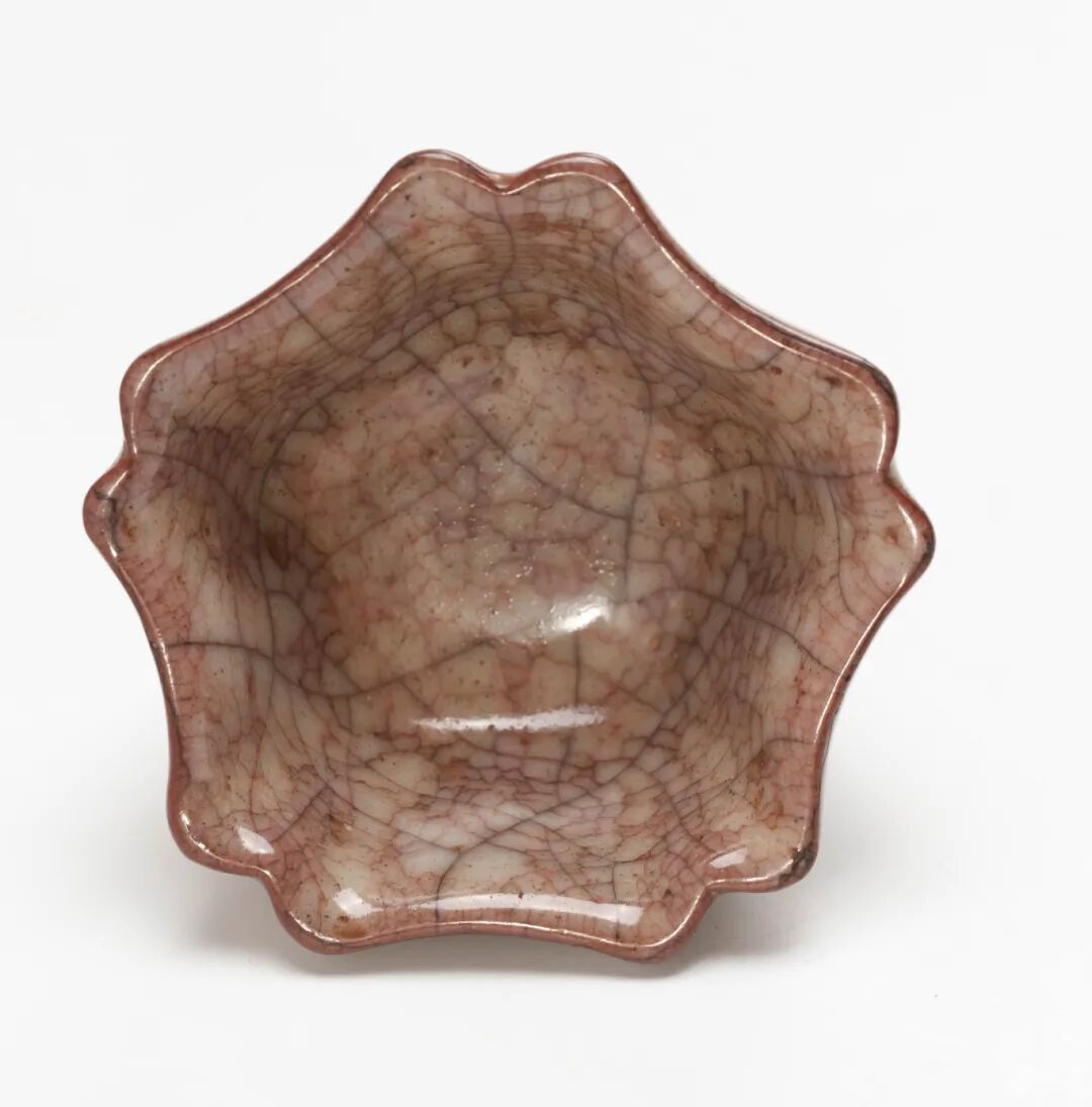 本件哥釉花口盃,盃口呈五方倭角形,斜壁,底部滿釉,並留有支釘痕跡,符合哥窯一貫風格。通體施米黃色釉,釉質肥潤如凝脂。因胎土含鐵量較高,燒造過程中鐵分溢出,形成暗紅色斑痕,俗稱“火焰紅”。是以本品所現紋片,較之常見的“金絲鐵線”,更具稀見的“紅絲鐵線”特徵。器形細巧,造型端莊古樸,兼具實用與審美,堪稱宋代哥窯器之代表作。