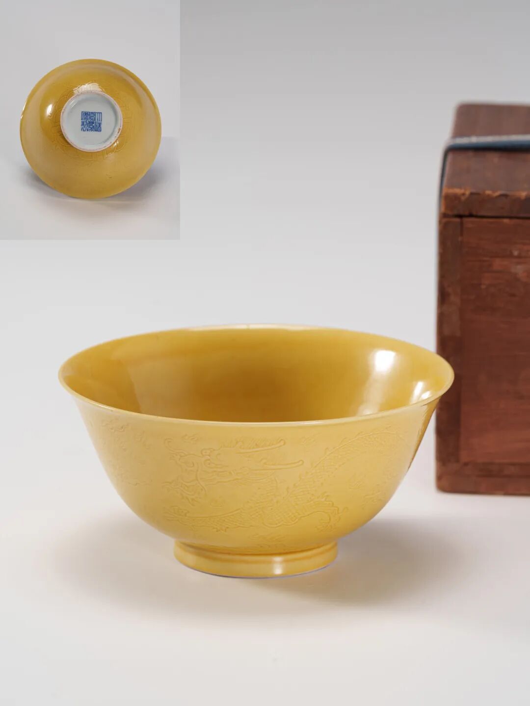 "據《明英宗實錄》卷一六一載:“禁江西饒州府私造黃、紫、紅、綠、青、藍、白地青花瓷……首犯淩遲處死,籍其家資,丁男充軍邊衛,知而不以告者,連坐。”其中黃釉位列首位,足見當時皇家對黃色的珍視程度之高,已上升至嚴苛法律層面,絕非一般顏料可比。拍品敞口,弧腹,圈足,器形端莊周正,比例勻稱,沉穩大氣。外壁通景暗刻雙龍趕珠紋,雙龍矯健挺拔,穿行於翻騰雲海之間,神態威猛,氣勢磅礴。近足處飾有一圈海水江崖紋,山巒起伏,波濤洶湧,數寸之地,盡顯排山倒海之勢。紋飾佈局繁而不亂,疏密有致,刻工細膩入微,極富動勢與張力。