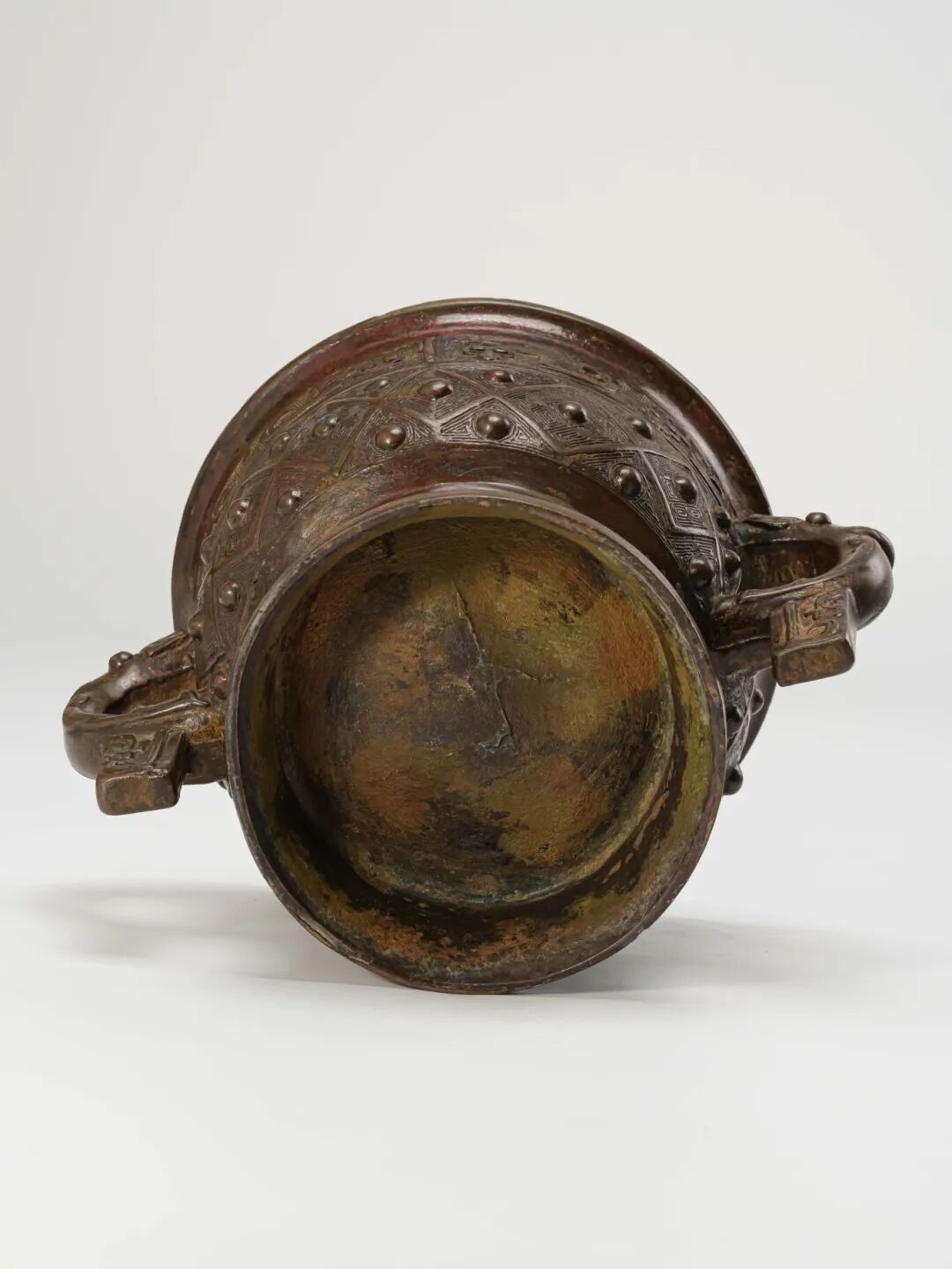 腹部滿飾百乳雷紋,又稱斜方格雷乳紋,是商周青銅器中的典型裝飾之一。紋樣由一格格斜方形組成,格邊飾以雲雷紋,中間凸起乳釘,繁而不亂,富有節奏感與立體感,常見於鼎、簋、罍等禮器之上。圈足亦起扉棱,並作對稱佈局的彎角鳥紋,線條古拙有力,寓意吉祥。兩側耳部浮雕盤龍形象,龍首圓雕凸出,額角上揚,尾部巧作方形垂珥,氣勢遒勁,神韻俱足。