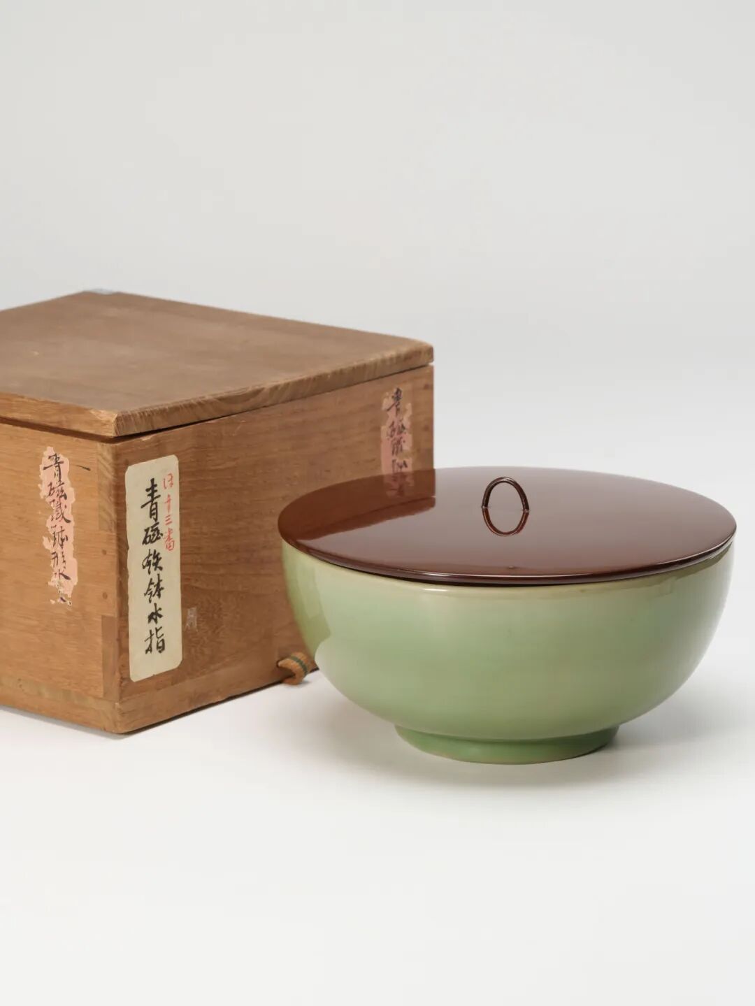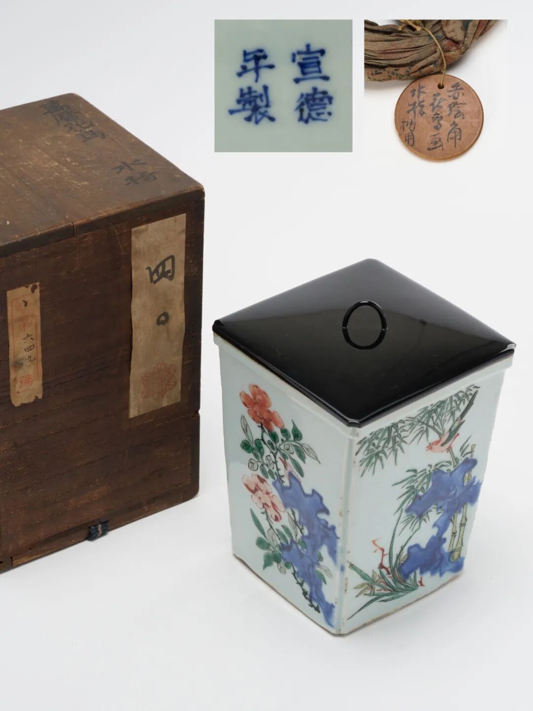 來源方面,經考證,原裝木箱上可見一枚印章,其圖案與紀州和歌山藩德川氏家紋“紀州六葵”完全一致,另有標籤上亦可見德川家族慣用之葵紋,為其舊藏提供有力佐證。更為重要的是,木盒上以墨書題有“萬曆花鳥水指”字樣,應為德川家族收藏時所作記錄,顯示當時即已珍之。