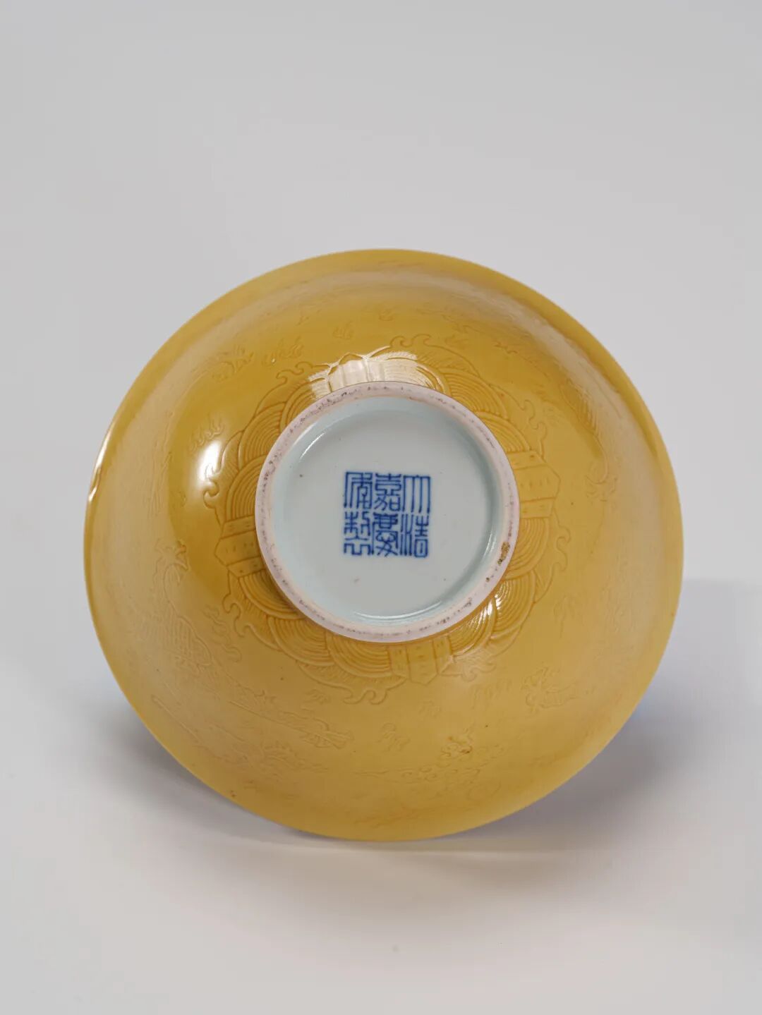 通體施黃釉,釉色嬌豔明亮,純淨勻潤,光澤柔和,浮光掠影間與暗花龍紋相映成趣,更顯層次分明,皇家禦瓷的雍容氣度。底書青花「大清嘉慶年制」六字三行篆書款,款識規矩嚴謹,字體方正遒勁,展現嘉慶官窯一絲不苟的制器規範。