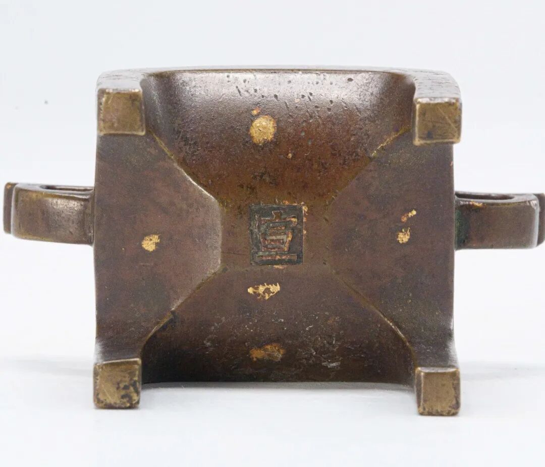 "此炉为精铜铸造,器形方正规整,工艺精巧考究。口呈长方,口唇平整薄利,颈部斜收而下,腹部略向外鼓起,四角过渡圆润自然。两侧对称安置双耳,线条简练有力。炉下承四足,姿态沉稳,四足与炉体一体铸成,腹底为斗形微拱,极具稳定感。