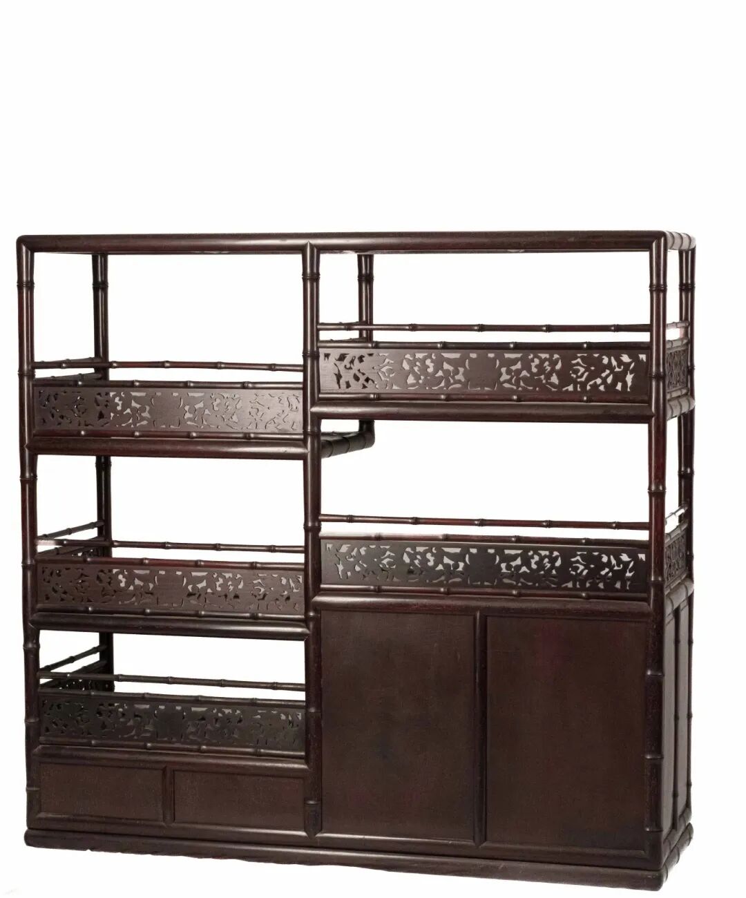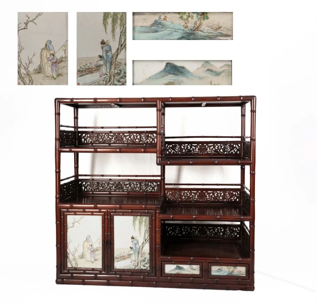整件博古架通體仿竹節造型,包漿溫潤,光澤內斂,形制雅致,不僅為瓷板之承載,更自成一件不可多得的陳設佳品。"