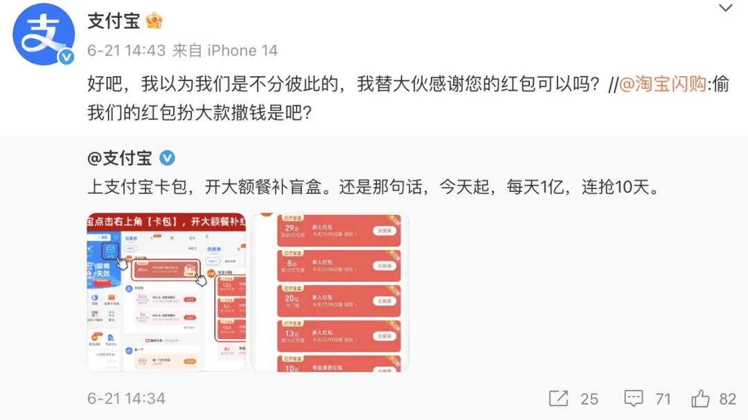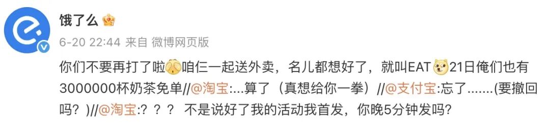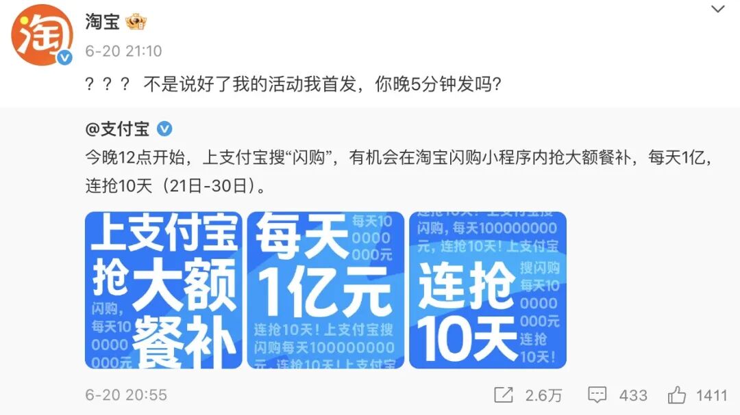给大家解释一下,就是支付宝和淘宝闪购合作,原本应该是淘宝作为品牌方、作为餐补红包的资金方,首发内容,没想到被支付宝抢先发了!