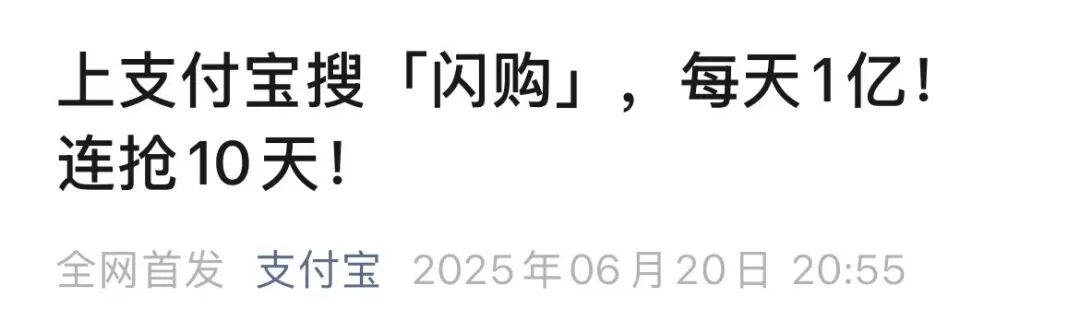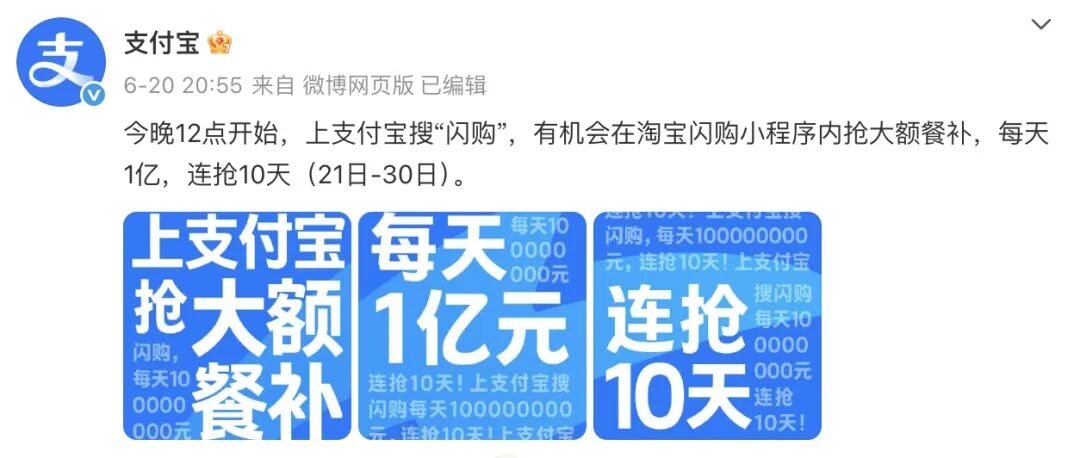 起因是在6月20日,支付宝宣布自21日零点起,支付宝也能上“闪购”平台,并且,用户可以领到连续10天的大额餐饮券。