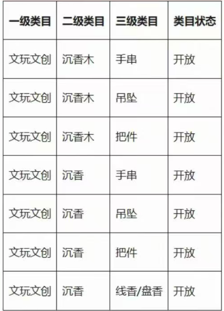 此次开放是在一级类目【文玩文创】下新增开放二级类目【沉香木】、【沉香】,涵盖了沉香手串、吊坠、把件、线香 / 盘香等多个细分商品领域 。