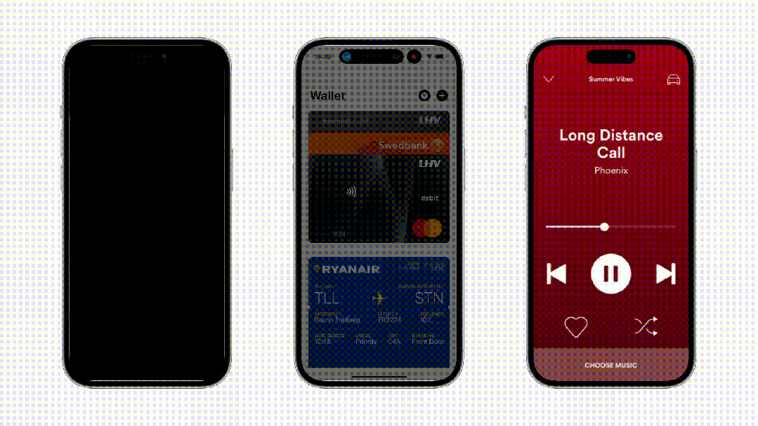 但是,如果在灵动岛展开的状态下打开 app,从概念上,用户的意图在于接收更多细节,这时候 app 就不会从灵动岛下滑出。这种场景下,如果 app 的图标可见,app 会从图标启动,如果 app 图标不可见,app 则会从右侧滑入。