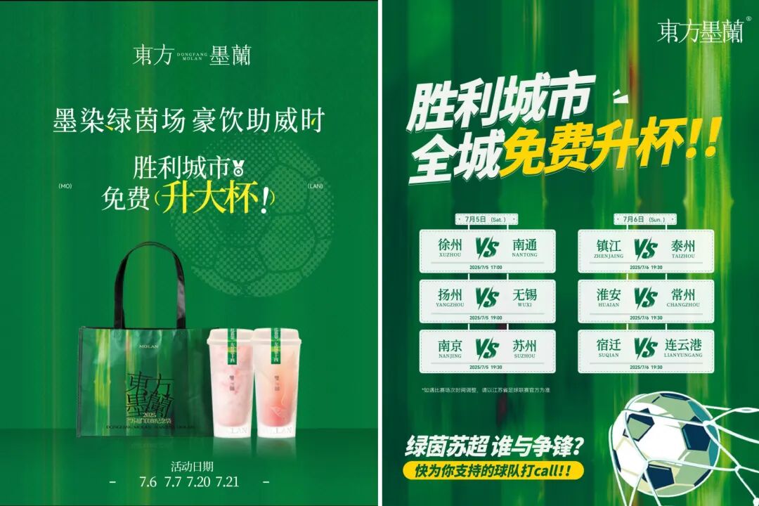 “没有假球,全是茶友”,7月5日,东方墨蘭推出“苏超”联名周边——墨入绿荫周边餐,包含“苏超联赛”纪念袋、“东方好球”限定杯贴。