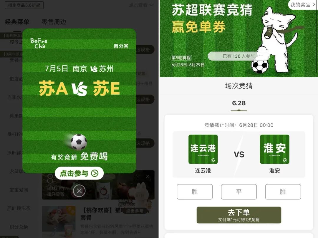 作为苏州本地茶饮百分茶,直接在小程序上开启赢球竞猜。点开小程序点单,菜单上方“有奖竞猜”活动吸引大波网友目光,点开后可以看到比赛的城市和选择的按钮,小程序实付满1元,连续猜对三次,就能获得一张饮品免费券。