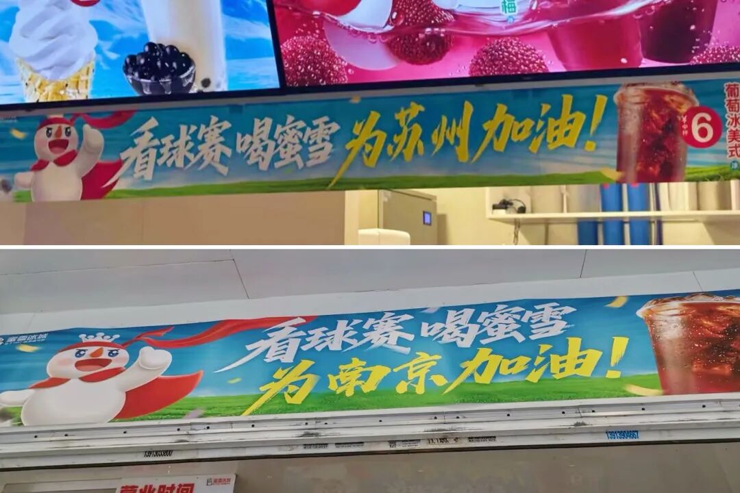 有趣的是,蜜雪冰城也去凑热闹,江苏不同城市的门店扯着“同样”的加油条幅,被网友揭穿“端水大师”。