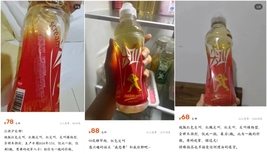 谁也未曾料到,这场短暂的复刻会在近一年后掀起更大波澜。2025年7月,随着这批产品临近保质期,二手市场突然掀起价格狂潮:#马上过期的“红色尖叫”被炒到68元#话题冲上微博热搜,单瓶标价从48元一路飙升至128元,整箱售价更是从千元级跃升至8900元的天价。这场完全由市场自发形成的消费现象,迅速演变为现象级舆论风暴。