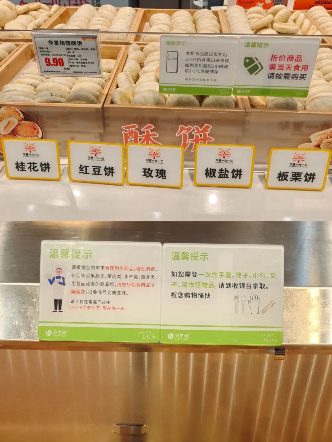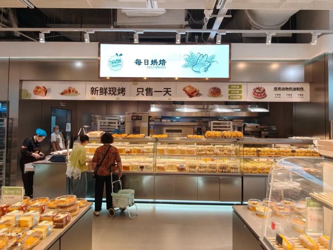 进入超市后,几乎占到超市面积一半的区域,便是熟食、烘焙、面点和生鲜区,尤其哈米客店内使用的分区招牌,和区域商超前辈鲜风生活也颇有几分相似性。
