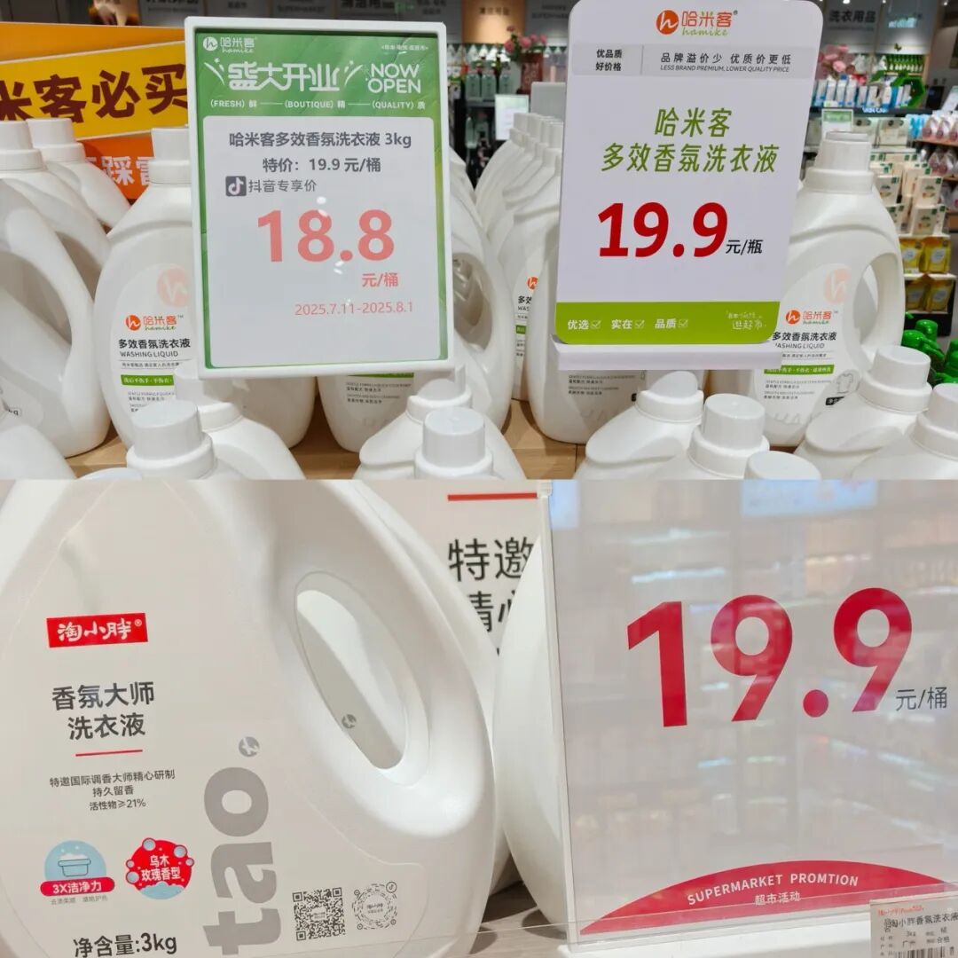 再以洗衣液为例,哈米客自营的多效香氛洗衣液3kg一桶售价19.9元(抖音限时团购价18.8元一桶),对比淘小胖的自营香氛洗衣液售价19.9元,但淘小胖在洗衣液外包装上特明注明:活性物大于等于21%。