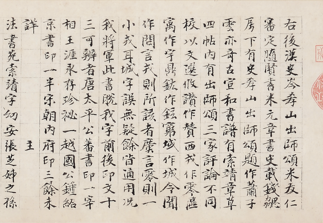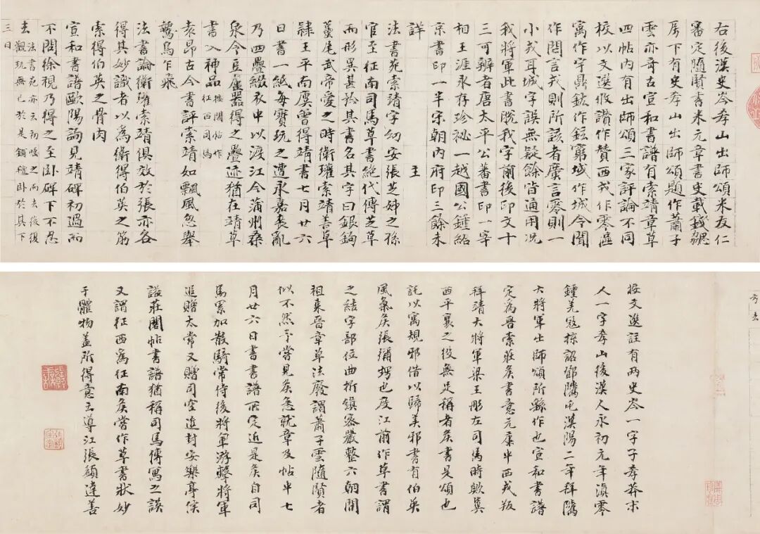 张达善,宋末元初人,(1236—1302),受业于金华王柏,潜心于朱熹之学。世祖和成祖时,任江宁学官,从游者甚众,称导江先生,荐为孔、颜、孟教授,尝箸《经说》,吴澄序其书,有《张达善文集》。《出师颂》卷后两跋,史称前跋为宋人,后跋为张达善,徐邦达先生和启功先生都认为两跋均为张达善所作。张跋的无偿捐贈让北京故宫所藏《隋人书出师颂》无缝合壁,且补了北京故宫元代早期书法之缺,东升兄之善意大也。张达善此跋高22厘米,长123厘米,600多字。现在看起来,当年徐邦达先生和启功先生力促北京故宫和文化部通过拍卖公司用2200万元买入《隋人书出师颂》和用3000万元买入《米芾研山铭》,真是高见。这两件艺术品如果出现在当今拍场,没有大几个亿,根本不可能将其收入囊中。
