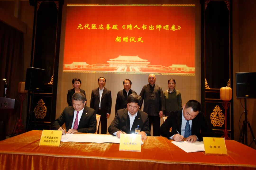 我和中国嘉德的缘分很奇特,我斋曾藏张达善两跋北京故宫所藏《隋人书出师颂》,来自于中国嘉德古籍拍卖。徐邦达先生和启功先生生前都希望我斋把张跋捐给北京故宫,让《出师颂》合壁。在我斋同意向北京故宫无偿捐赠张跋以后,东升兄希望由中国嘉德购买张跋百分之五十的权益,然后由中国嘉德和陆牧滔共同向北京故宫捐赠张跋,在北京马会的饭桌上差不多用了几分钟就把事情谈妥了。接着由中国嘉德对张跋进行价值评估,完成评估以后我斋全权委托胡妍妍总经理办理向北京故宫捐赠张跋的有关全部手续。