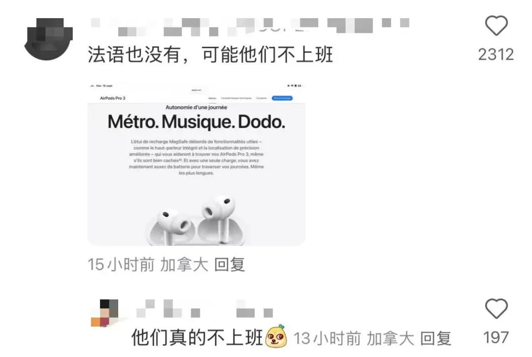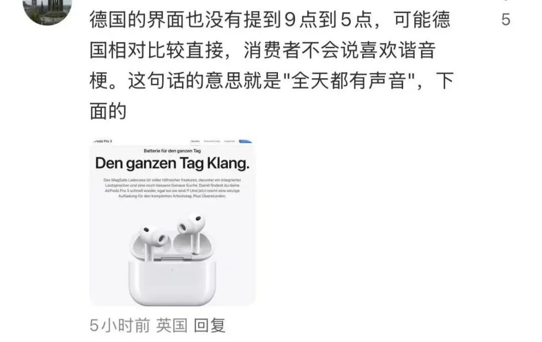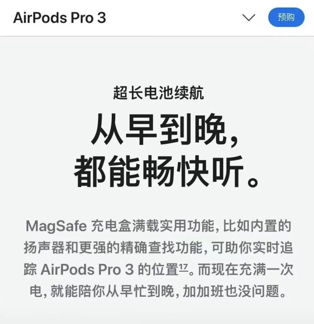 原因是有网友发现苹果 AirPods Pro3在中国大陆的宣传文案和美国的宣传文案不一样: