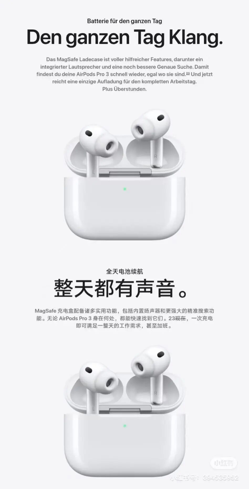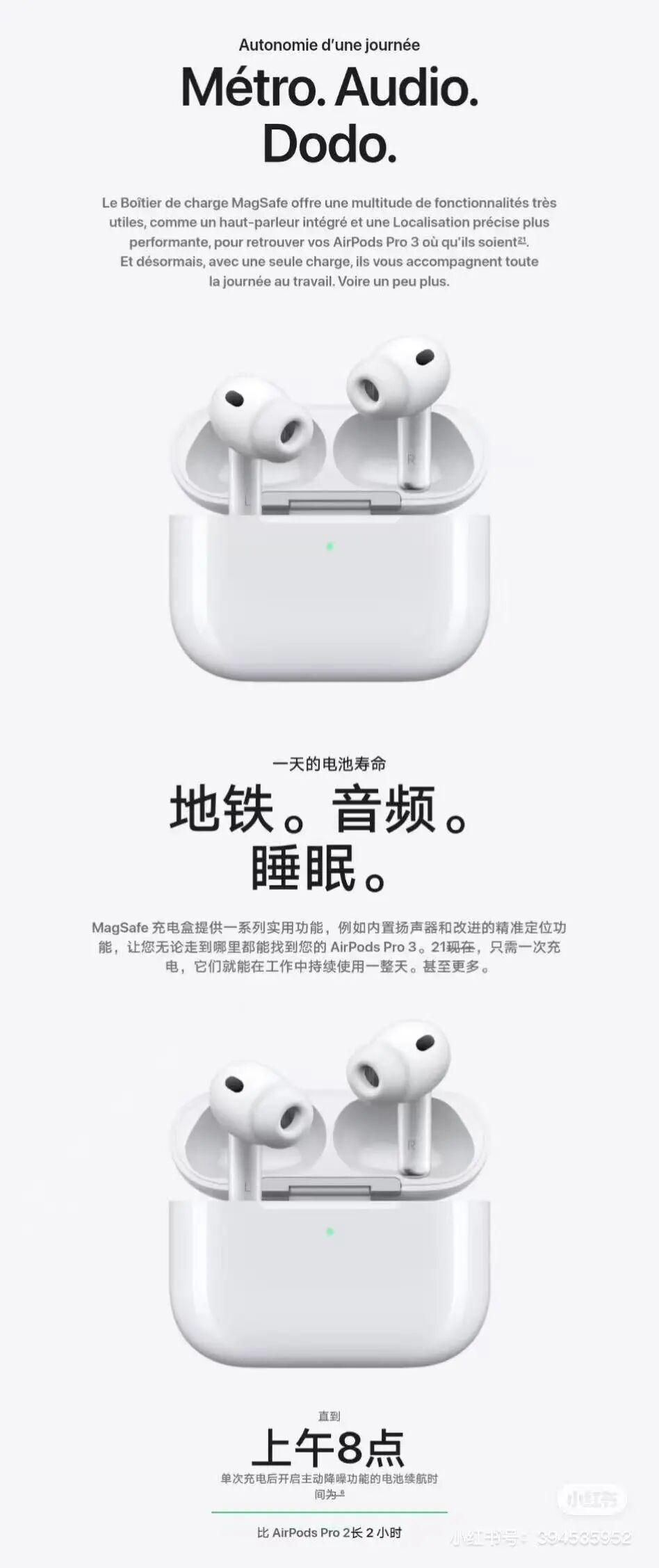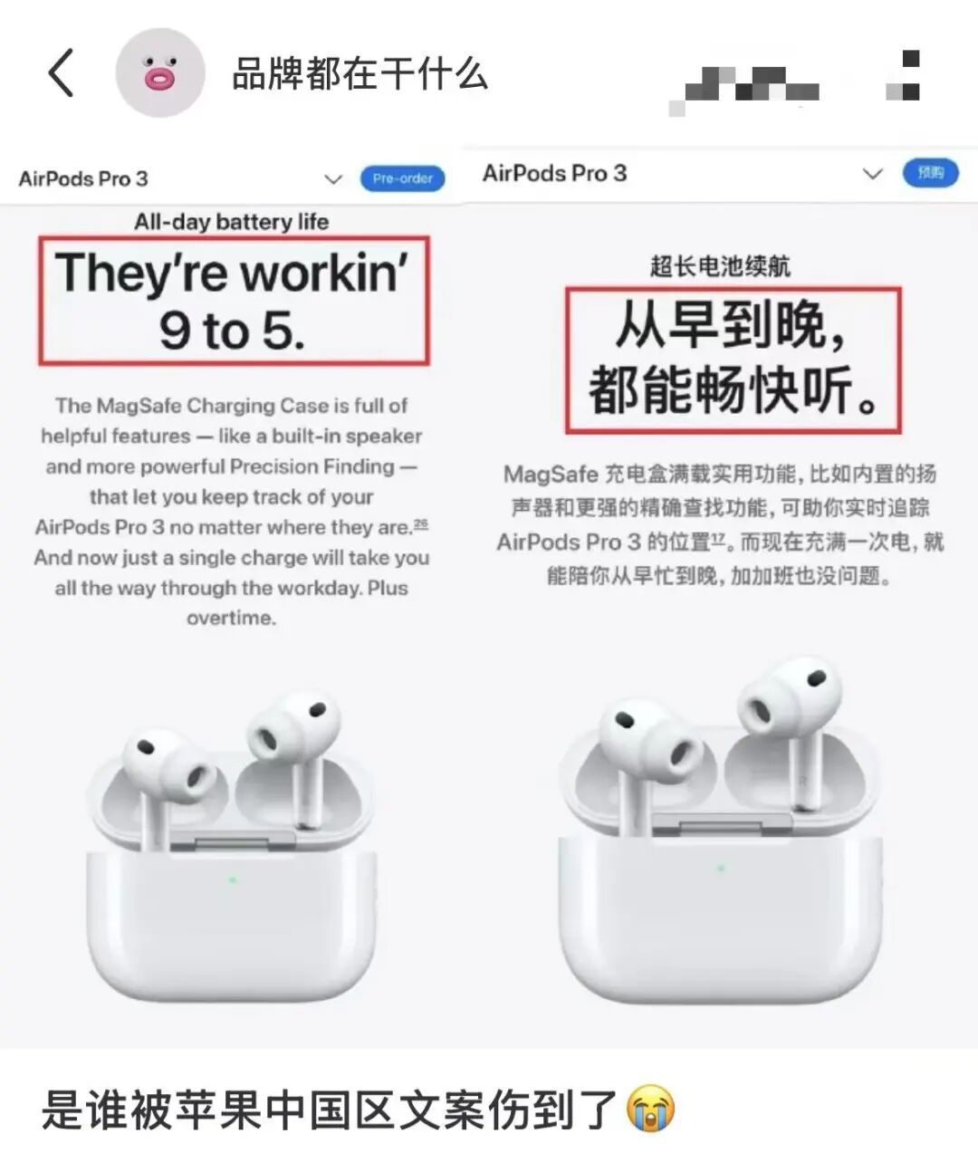 原因是有网友发现苹果 AirPods Pro3在中国大陆的宣传文案和美国的宣传文案不一样: