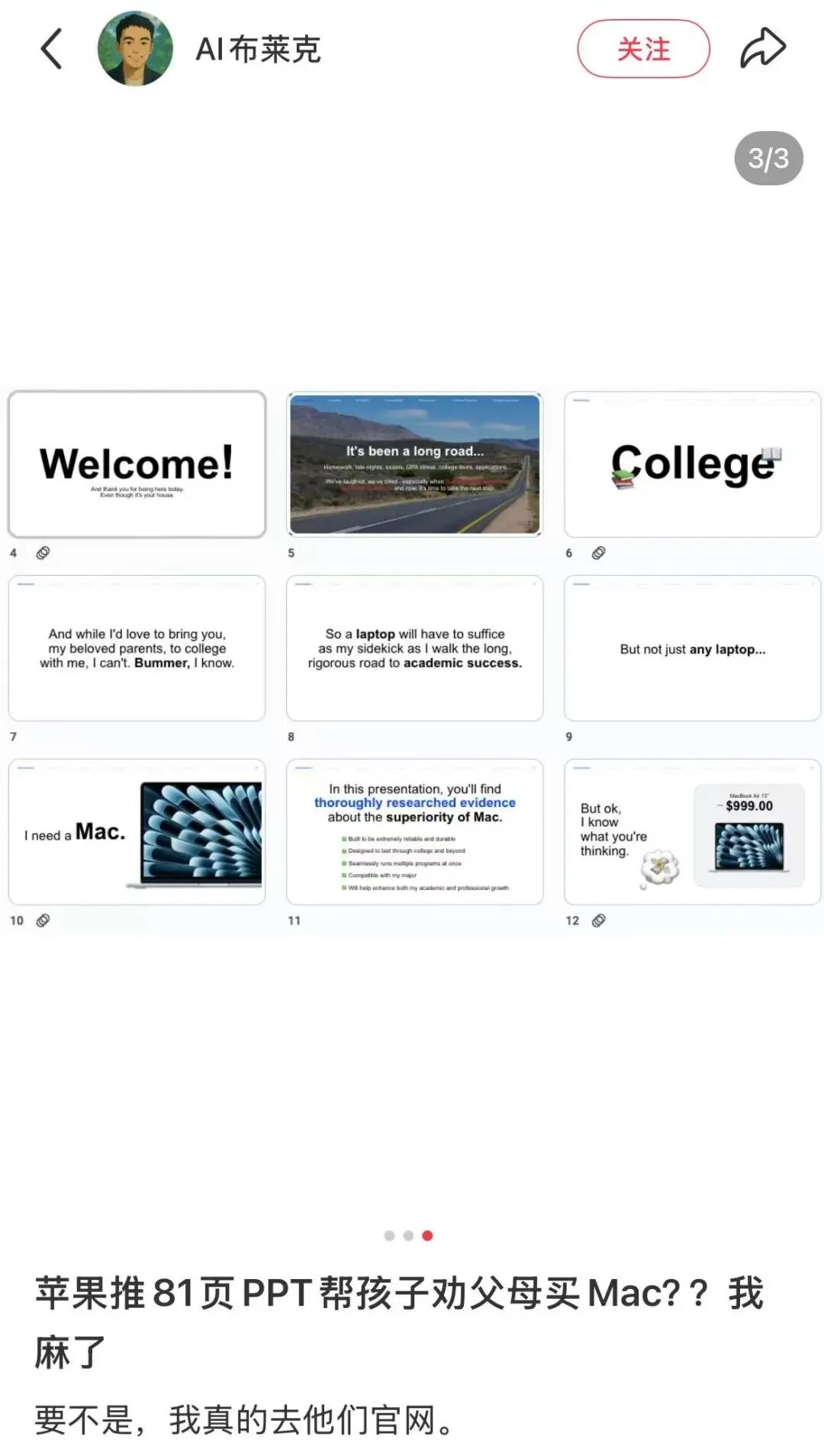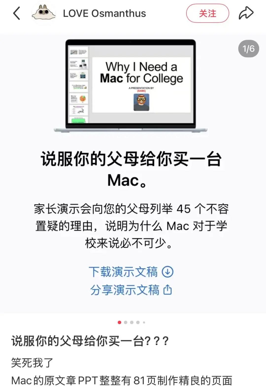今年6月份的时候,还有网友爆料苹果在美国苹果的大学生网站上上传了81页的ppt,内容是“说服你的父母给你买一台苹果”。