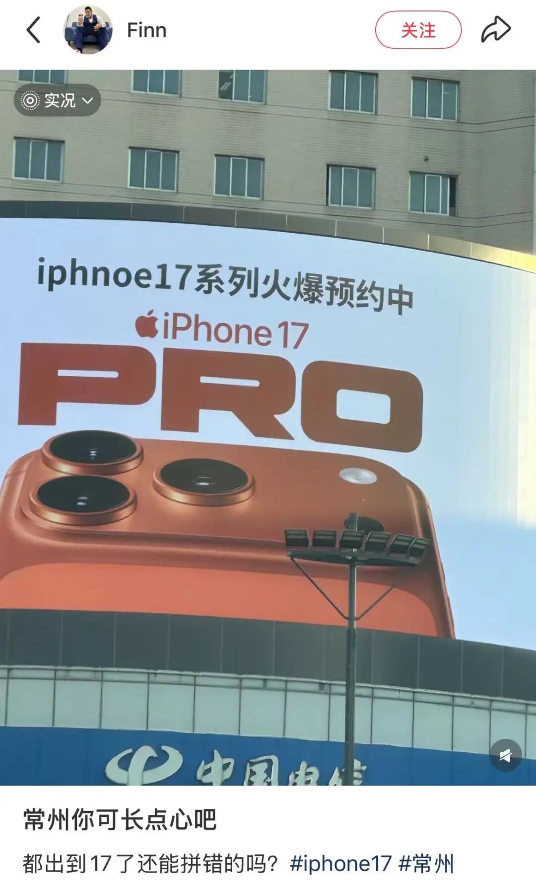 有网友发现苹果在常州的广告海报上出现了错别字,黑色字体里,把“iPhone”拼成了“iphnoe”。