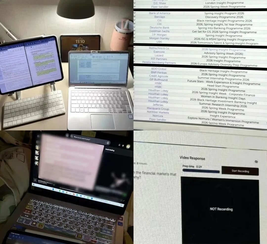 基本每一家公司 spring week 都有网测,只不过每一家用的OT题库不同。高盛去年免OT,但今年未必。OT题型多为性格测试和职场情景模拟,考察文化匹配度。HireVue需面对镜头录制1-2分钟回答。