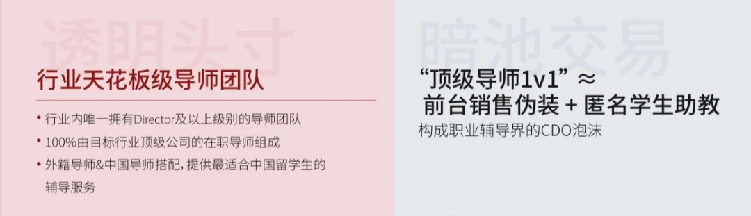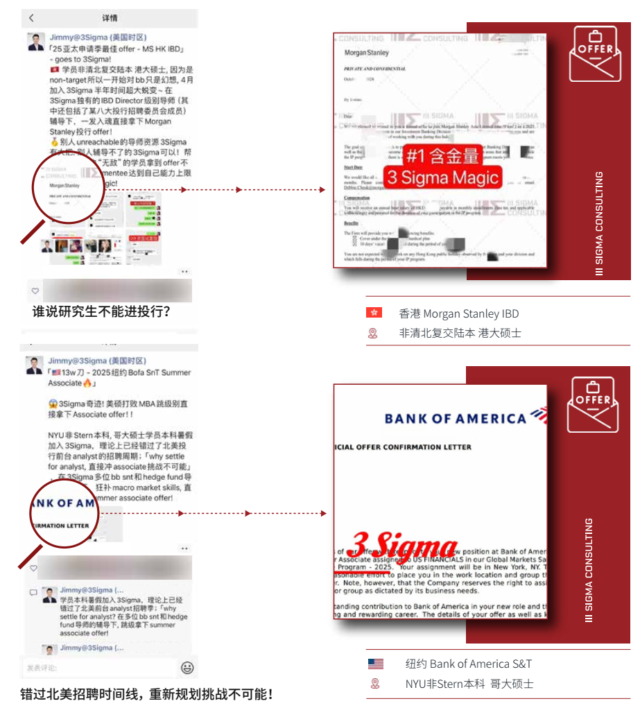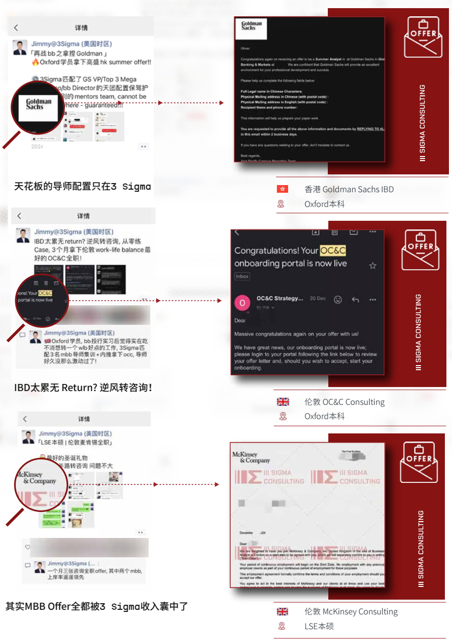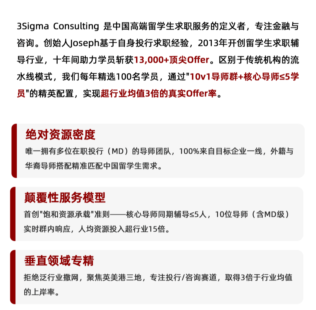 对比使用1-2个低级别不知名junior导师、“大四学长学姐”助教完成辅导的公司,3 Sigma学员签约即匹配众多MD/D/VP/Principal等超高级别投行咨询在职导师!