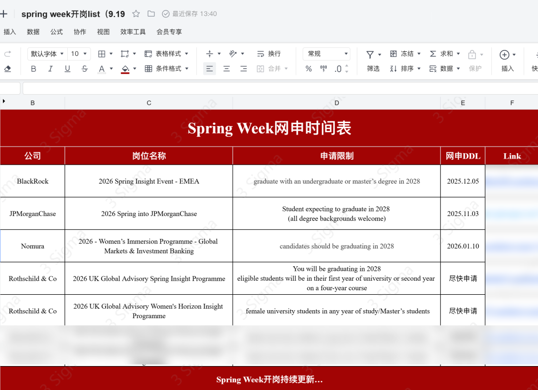 为了第一时间获取Spring Week开岗信息,避免错过重要岗位投递,3Sigma已为mentee准备 ??【Spring Week开岗 list】 ,现开放给牛津er!