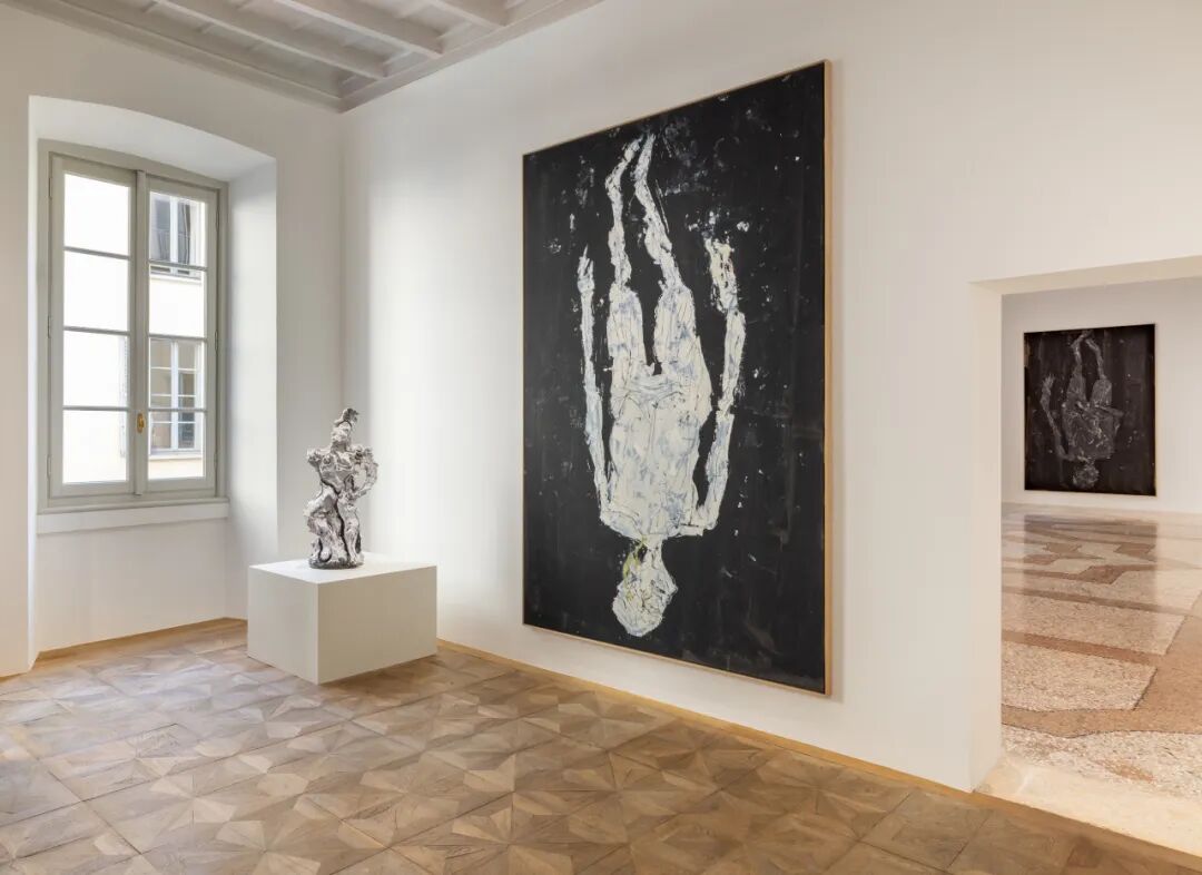 展览中的巴塞利兹作品包括一件全新的大型青铜雕塑,以及数幅绘于近年的绘画。这些画面中常见空洞无光的中心,或悬浮在幽暗背景中、仿佛从黑暗中跃出的形体,与丰塔纳不断探索“画布之外”的实践形成呼应。